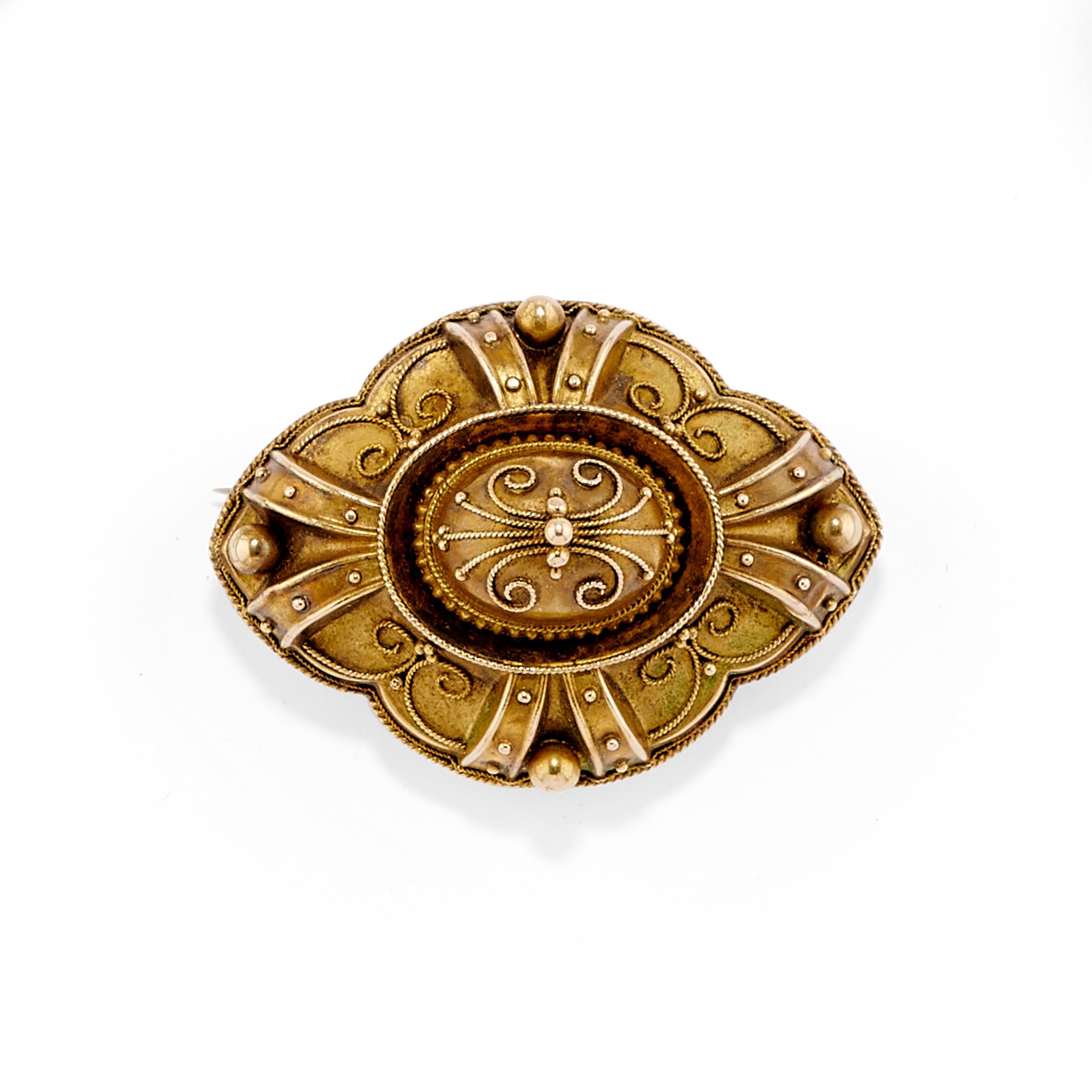 a forma di scudo realizzato in lamina con decori in filo d'oro ritorto e boules, difetti (visibili ammaccature al retro).