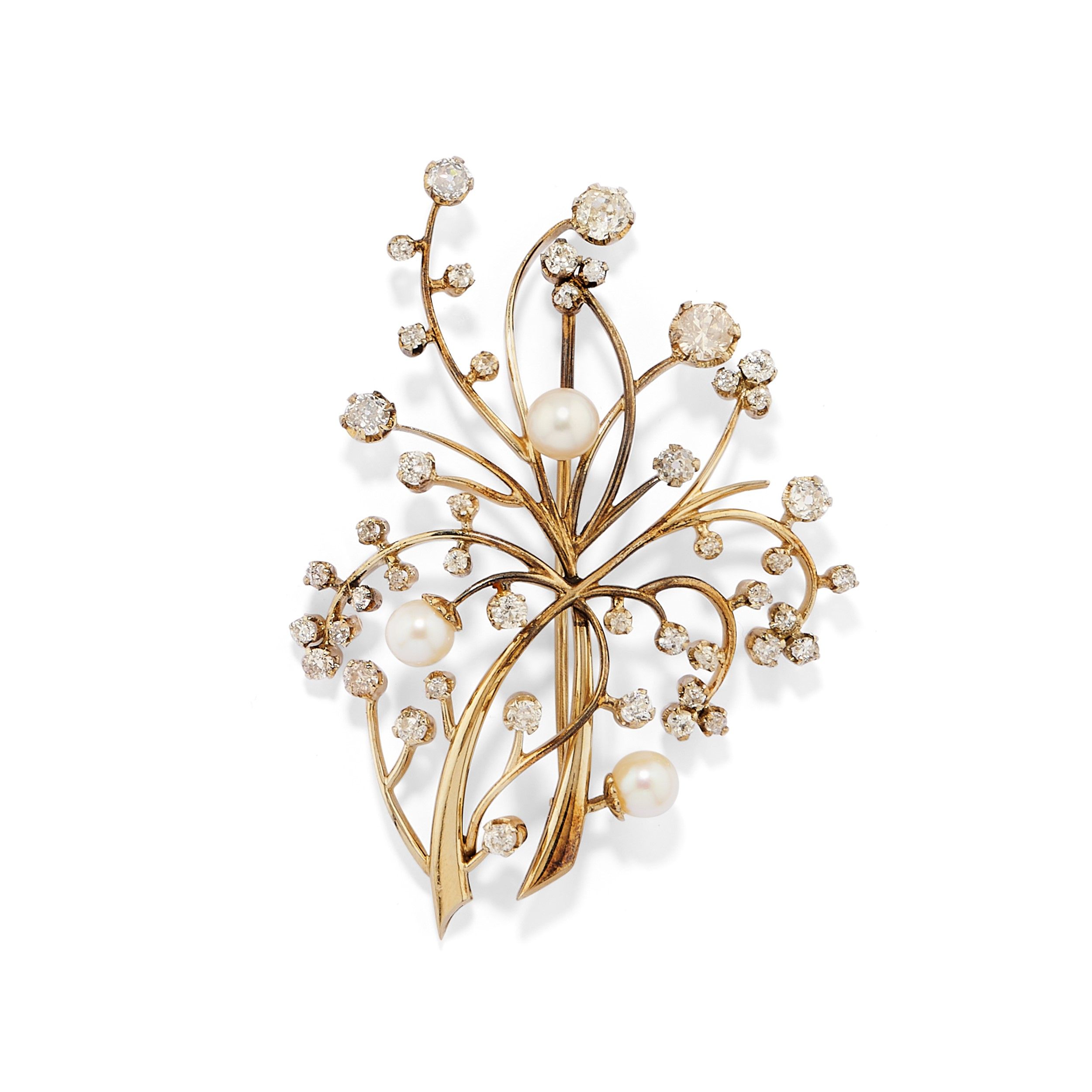 a ramage, diamanti taglio vecchio per totale ct 3,50 circa e perle coltivate di mm 6,50 circa.