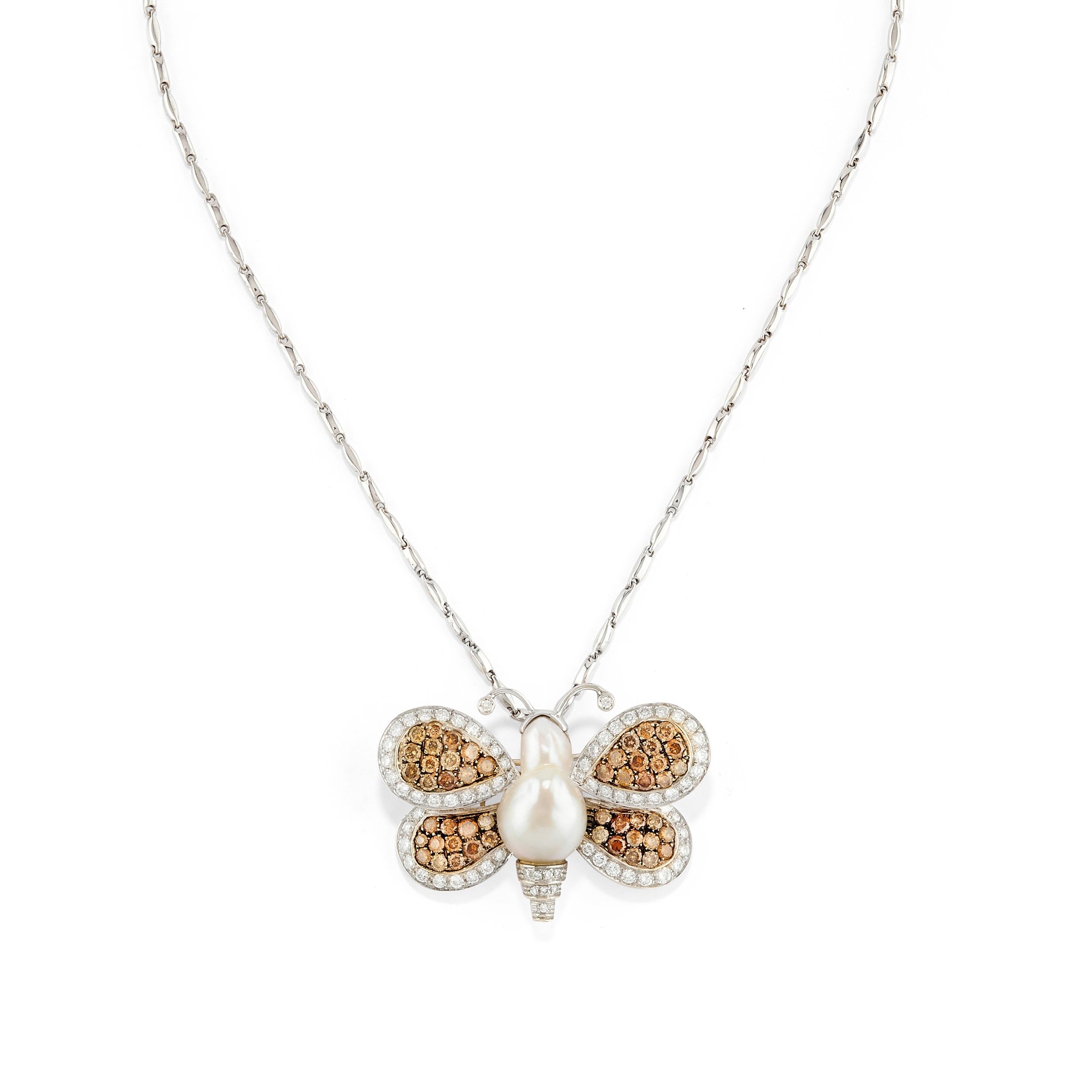 in oro bianco 18k, Peso g 29,80 cm 3,40x4,80 cm 43,00 a forma di farfalla con diamanti fancy color cognac ed incolori per totale ct 6,00 circa al centro perla coltivata barocca, trattenuta da collanina in oro bianco 18k, difetti (un diamante mancante).