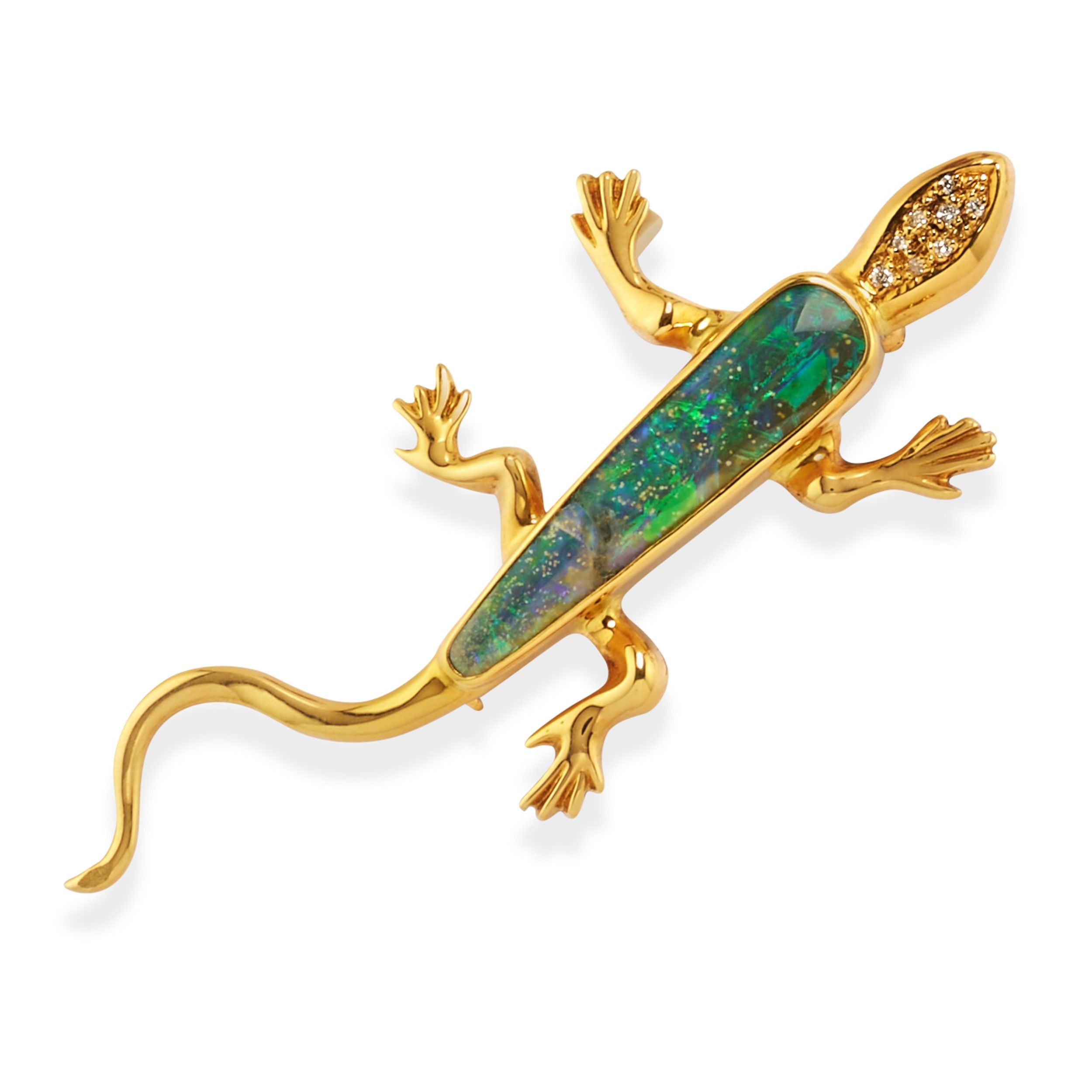 a forma di lucertola, con opale taglio fantasia e diamanti taglio brillante per totale ct 0,05 (caratura incisa), difetti (visibile rottura sull'opale).