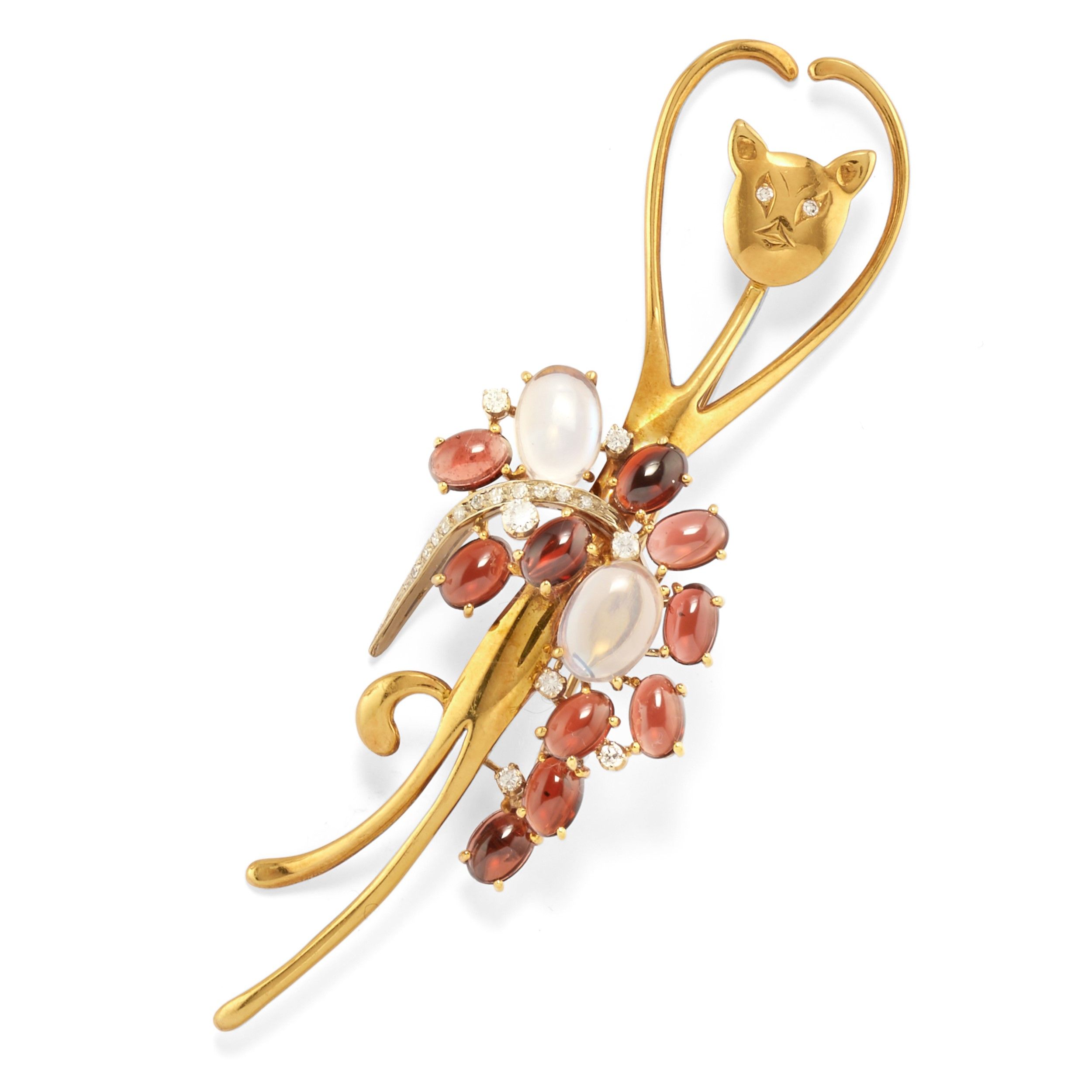a forma di gatto, diamanti taglio brillante e huit-huit e pietre colorate taglio ovale cabochon.