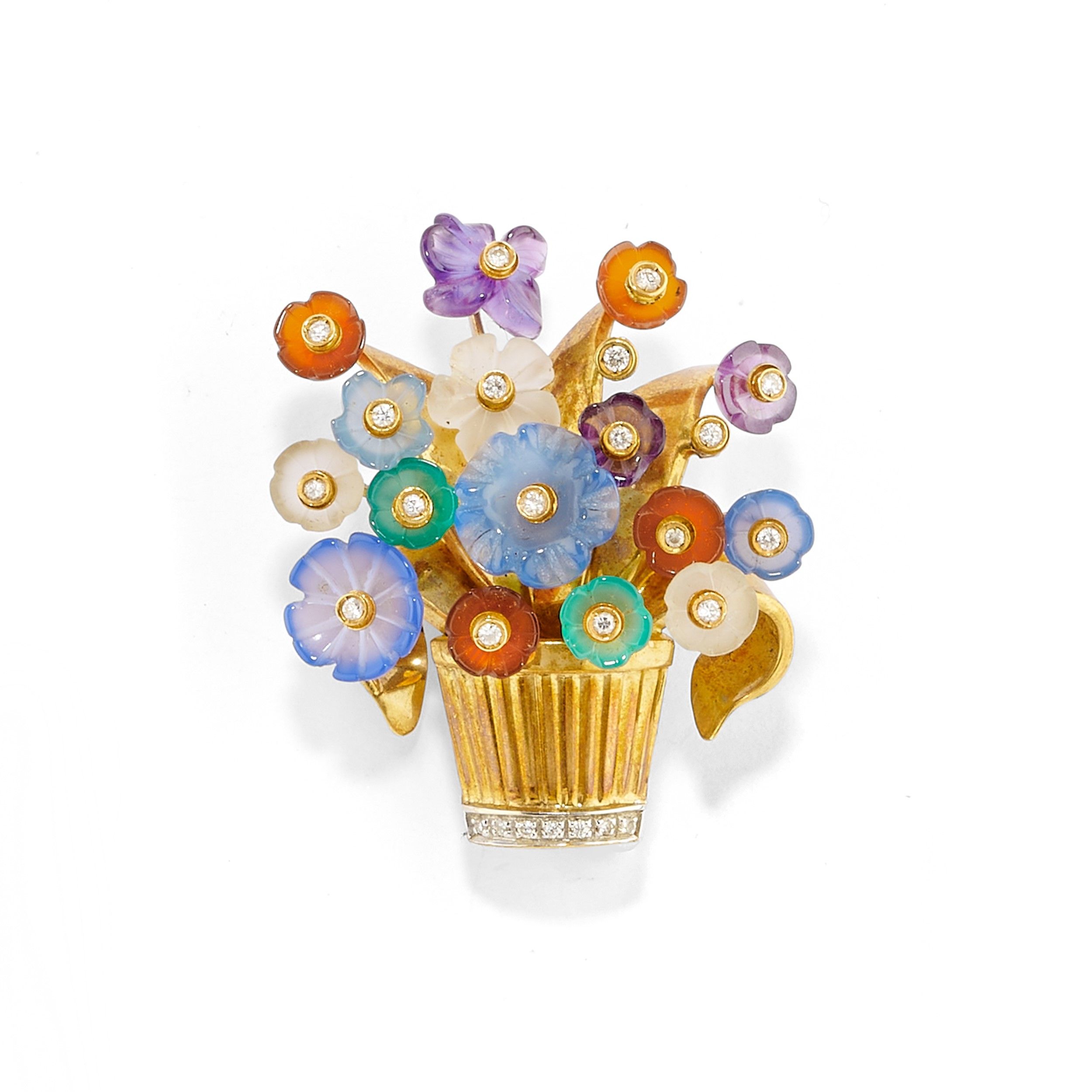 a cestino fiorito con pietre dure e piccoli diamanti taglio brillante.
