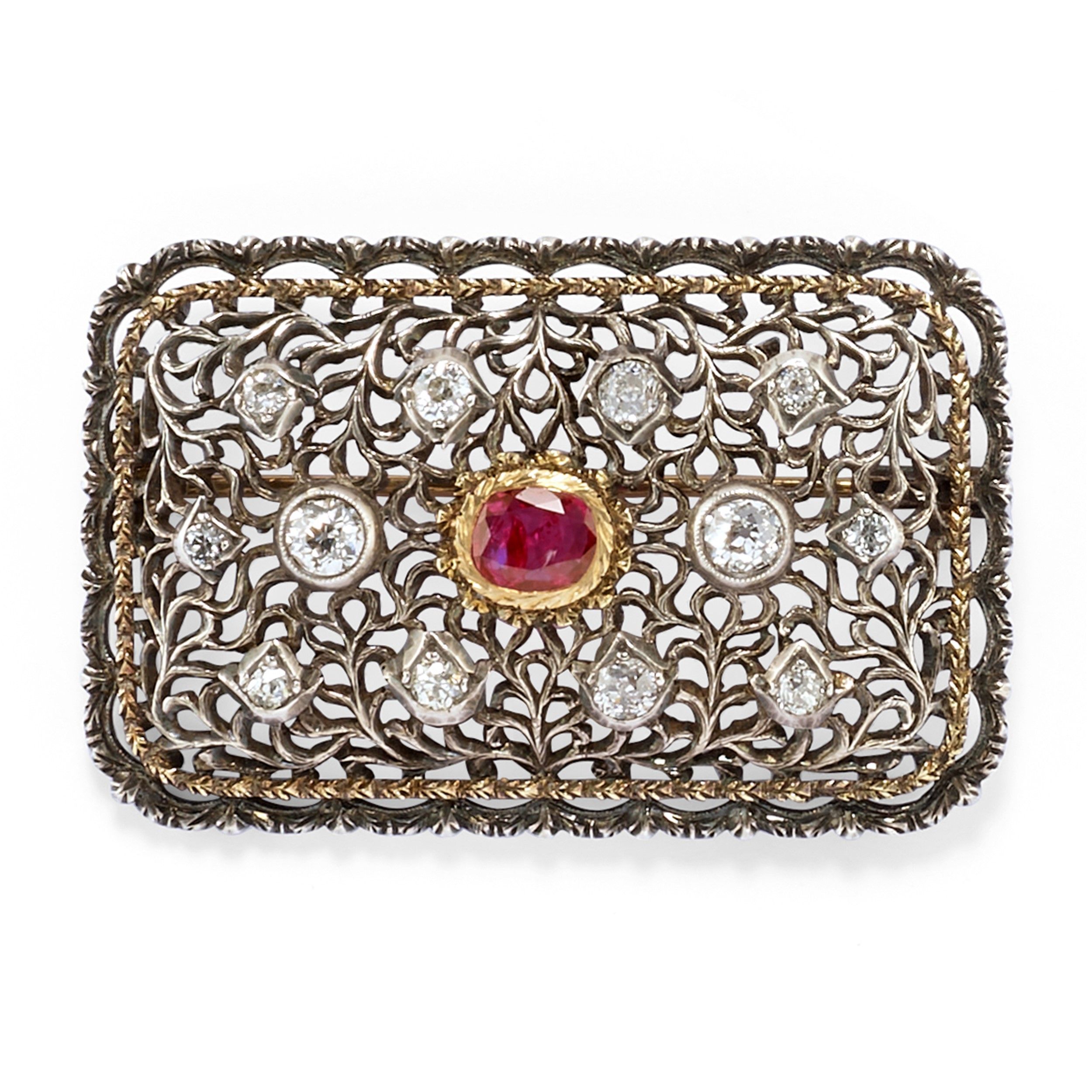 di forma rettangolare, interamente traforata, al centro rubino taglio ovale e diamanti taglio brillante, difetti (un diamante sintetico).