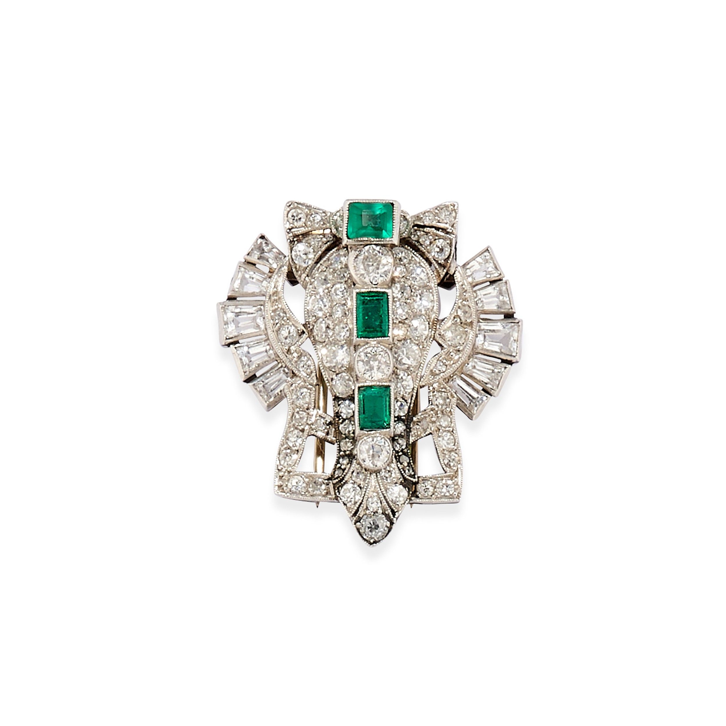in platino, Peso g 10,70 cm 2,80x3,10 1930 circa a scudo con al centro due smeraldi taglio rettangolare a contorno ottagonale ed uno ad imitazione, diamanti taglio vecchio per totale ct 2,00 circa, ai lati pietre incolori ad imitazione del diamante taglio tapered baguette.