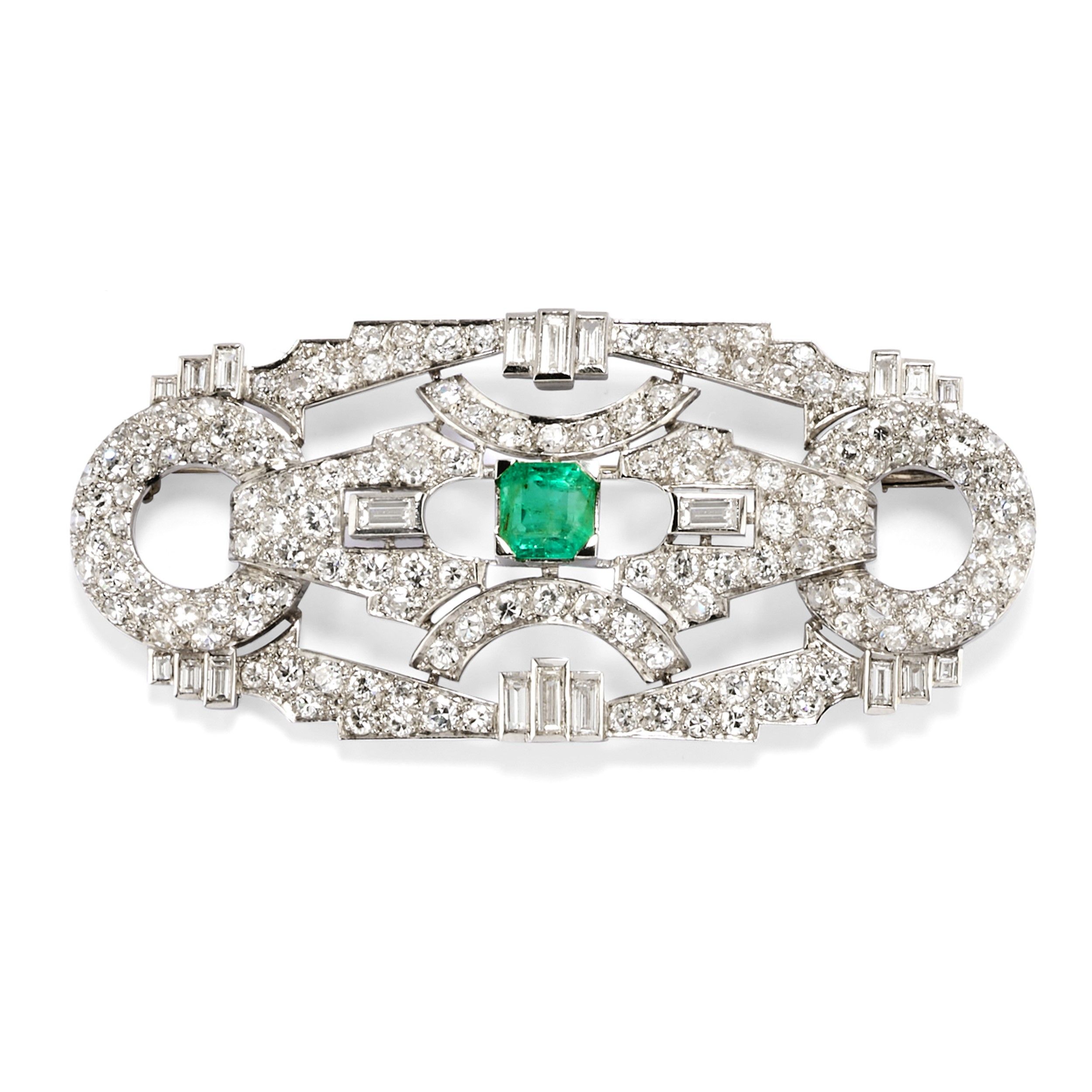 1920 circa di forma allungata, al centro smeraldo taglio quadrangolare a contorno ottagonale di ct 1,00 circa, diamanti taglio baguette, vecchio e huit-huit per totale ct 8,00 circa.