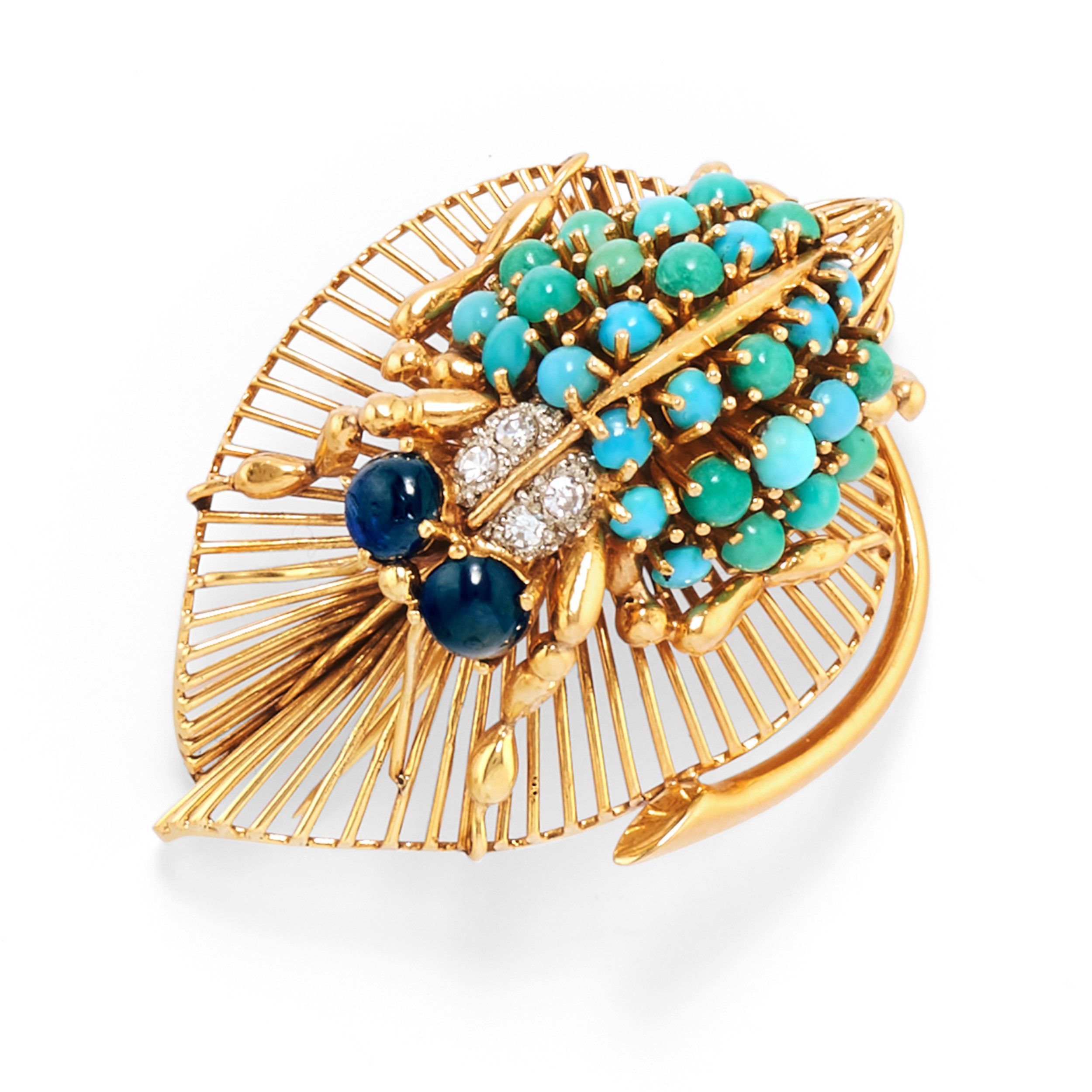 raffigurante scarabeo, realizzato con turchesi e zaffiri taglio rotondo cabochon, diamanti taglio huit-huit, poggiante su foglia realizzata in filo d'oro.
