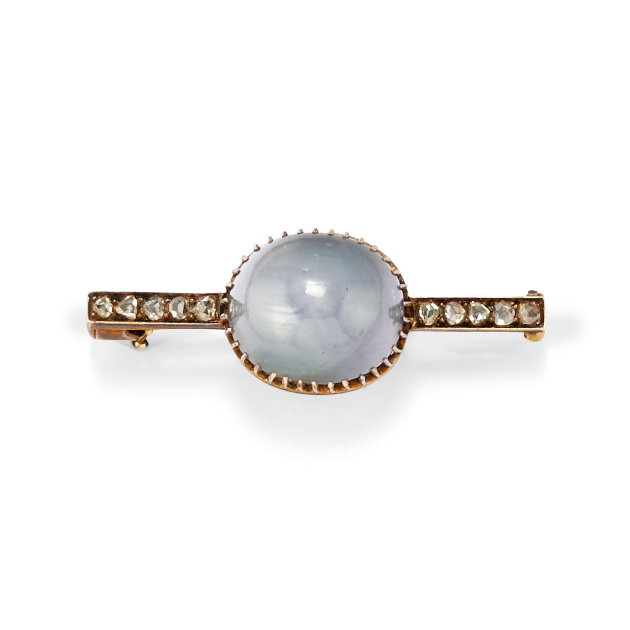 a barretta, con zaffiro Sri Lanka taglio ovale cabochon di ct 23,52 circa, ai lati diamanti taglio rosa.