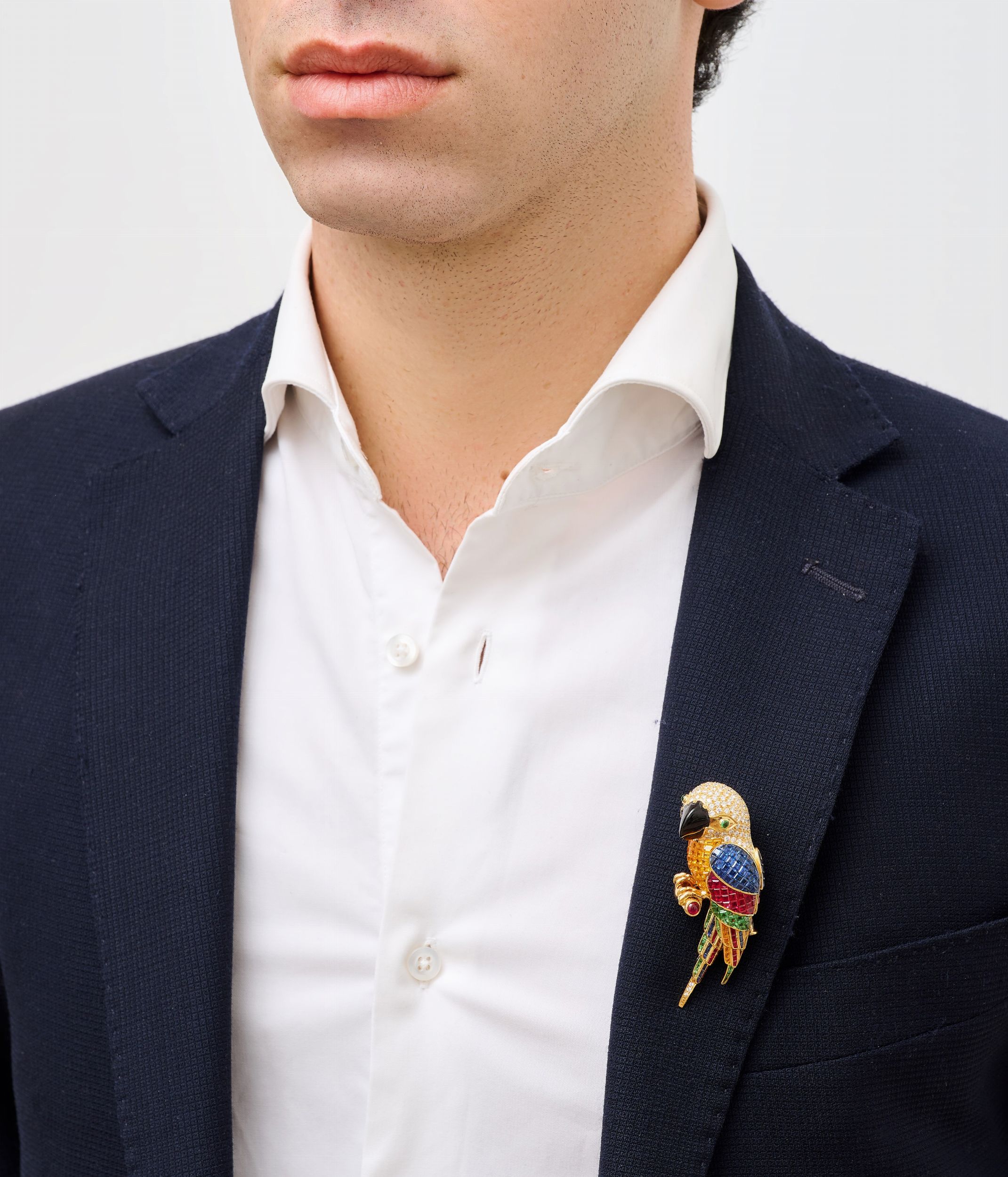 realizzata con rubini, zaffiri e zavorriti di differenti tagli, diamanti taglio brillante e decoro in smalto nero, reca firma Bulgari.