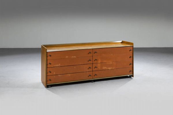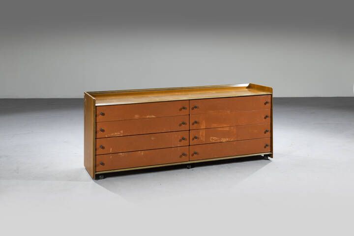 Cassettiera in legno con rivestimento in pelle e particolari in metallo. Prod. Maxalto anni '70 cm 72x180x45 Difetti