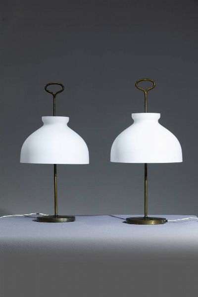 Struttura in ottone e diffusore in vetro incamiciato opalino. Prod. Azucena anni '50 h cm 56x28 Bibl.: Azucena mobili e oggetti a cura di M. Imparato F. Radaelli S. Milesi Azucena Milano 2012 p. 232-233; G. Gramigna Le fabbriche del design. I produttori dell'arredamento domestico in Italia Allemandi Torino 2007 p. 43; G. Gramigna Repertorio del design italiano 1950-2000 per l'arredamento domestico Allemandi Torino 2003 vol. 1 pag. 49 Piccoli difetti