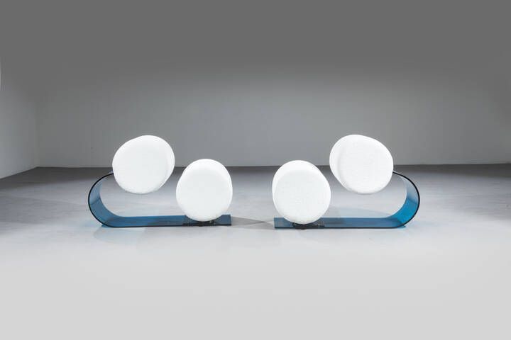 Struttura in plexiglass imbottitura rivestita in tessuto e particolari in ottone. Anni '70 cm 75x120x63 Piccoli difetti
