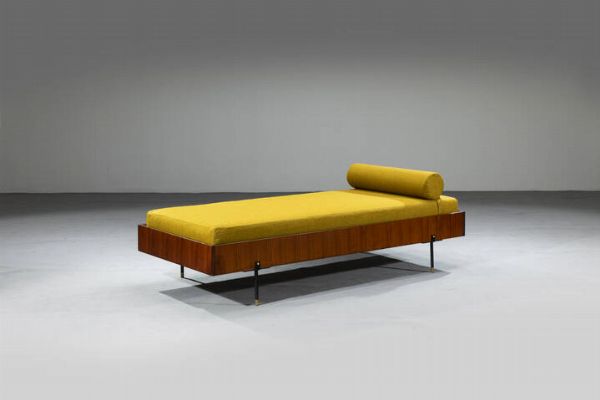 Struttura in legni imbottitura rivestita in tessuto e particolari in ottone. Anni '50 cm 45x197x87 5 Difetti