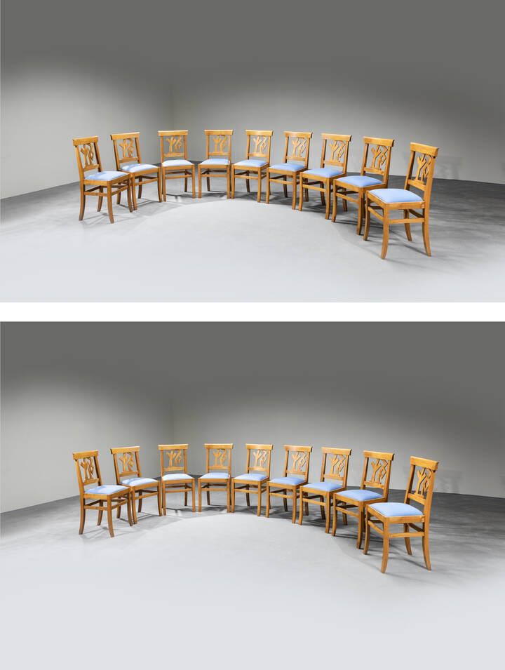 Diciotto sedie in legno schienale intagliato e seduta imbottita rivestita in stoffa. [..]