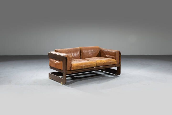 Struttura in legno rivestito in pelle e particolari in ottone. Anni '70 cm 67x150x80 Difetti