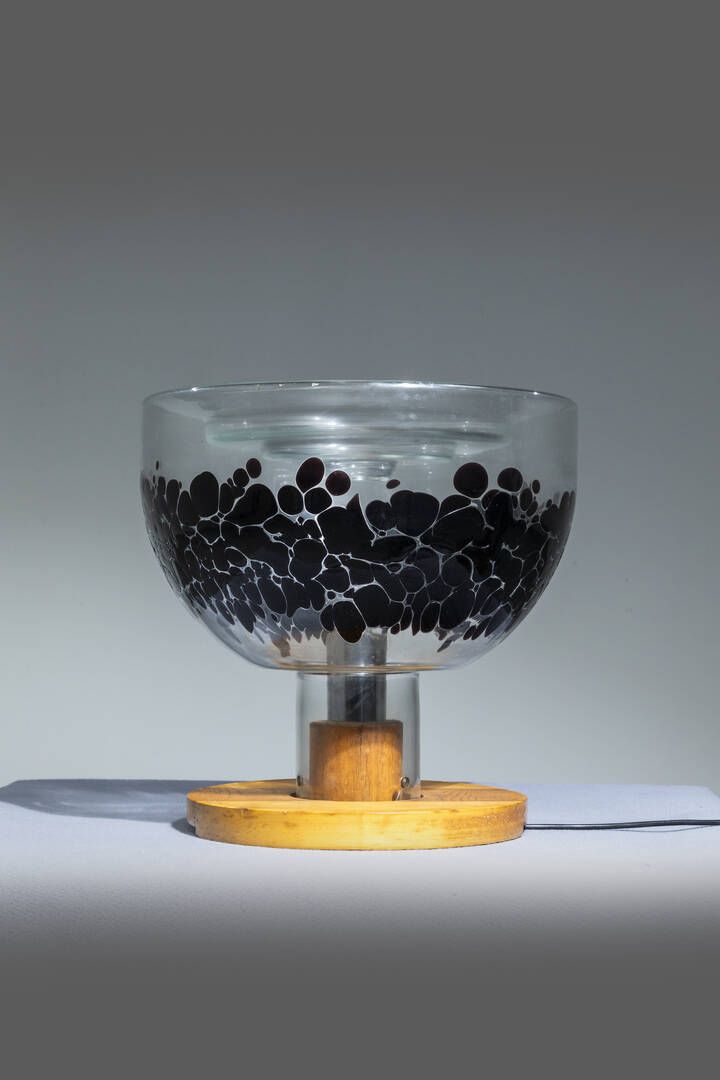 Struttura in legno diffusore in vetro. Anni '70 h cm 42 5x43 5 Sbeccatura sul paralume
