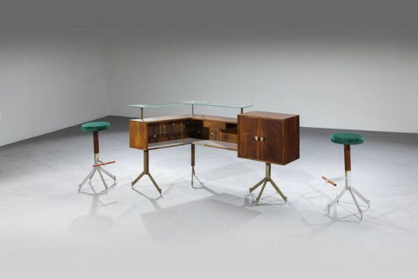 Struttura in legno e ottone piano im vetro imbottitura rivestita in tessuto e dettagli in metallo smaltato. Anni '60 cm 93x185x34 cm 72x37 Difetti