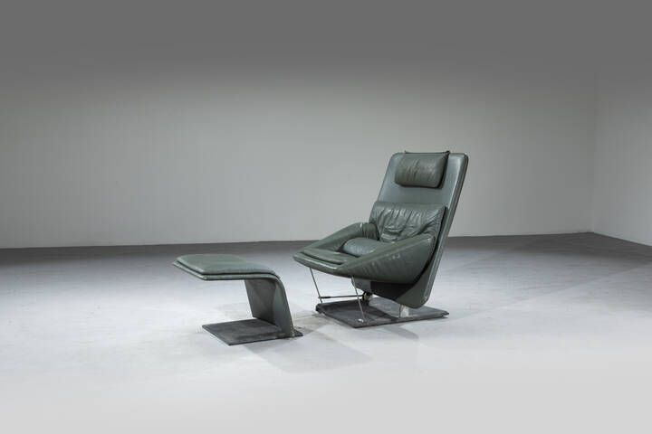 Struttura in acciaio cromato gomma e imbottitura rivestita in pelle. Anni '70 cm 100x86x85 cm 42x60x55 Difetti
