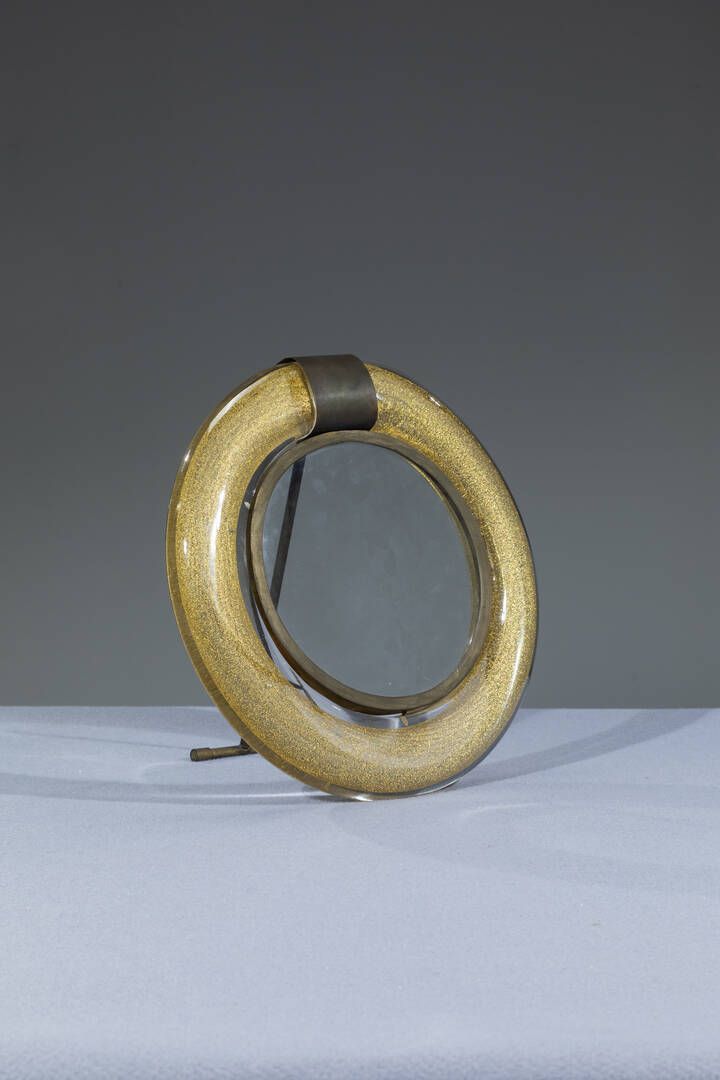 Vetro con incisione di foglia d'oro e particolari in ottone. Anni '50 cm 33x32