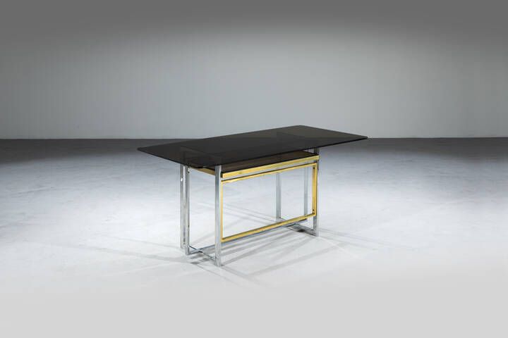 Struttura in acciaio e ottone piano in vetro fumè. Anni '70 cm 73 5x160x75 Difetti
