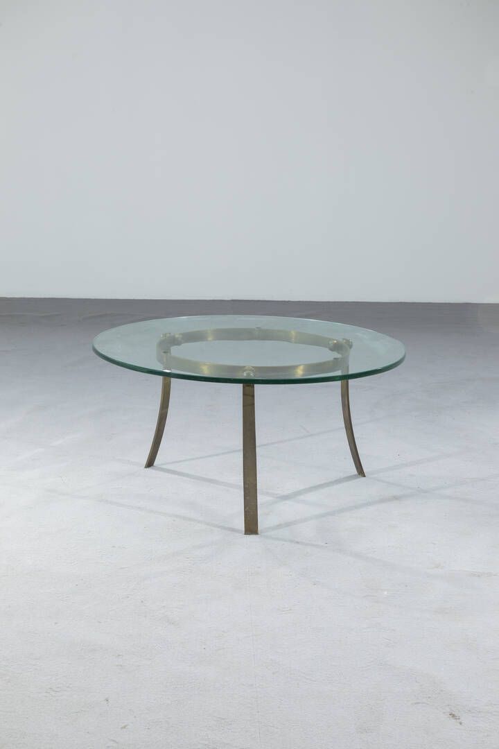 Struttura in ottone e piano in vetro. Anni '50 cm 47 5x98x98 Sbeccature del piano