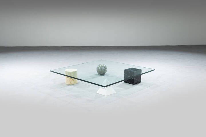 Basi geometriche in marmo colorato e piano in vetro. Marmo originale Prod. Casigliani 1979 cm 22x120x120 Bibl.: Giuliana Gramigna Repertorio del Design Italiano 1950-2000 Allemandi 2011 pag. 266 Difetti