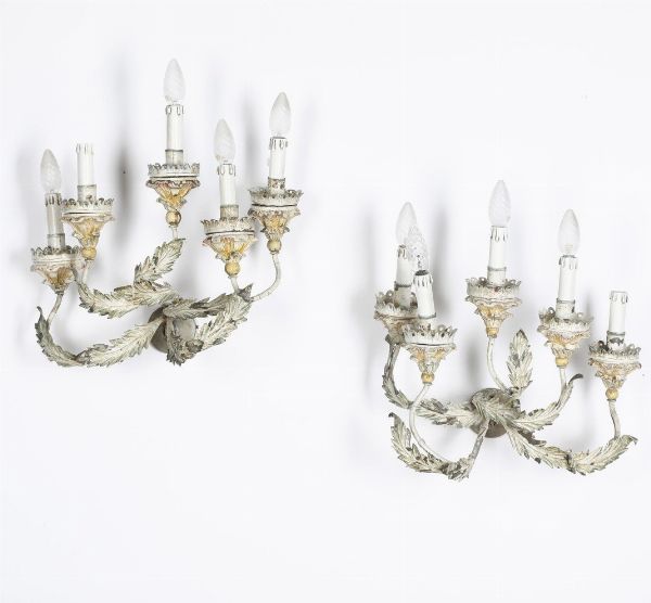 Coppia di appliques a cinque bracci in lamierino dipinto