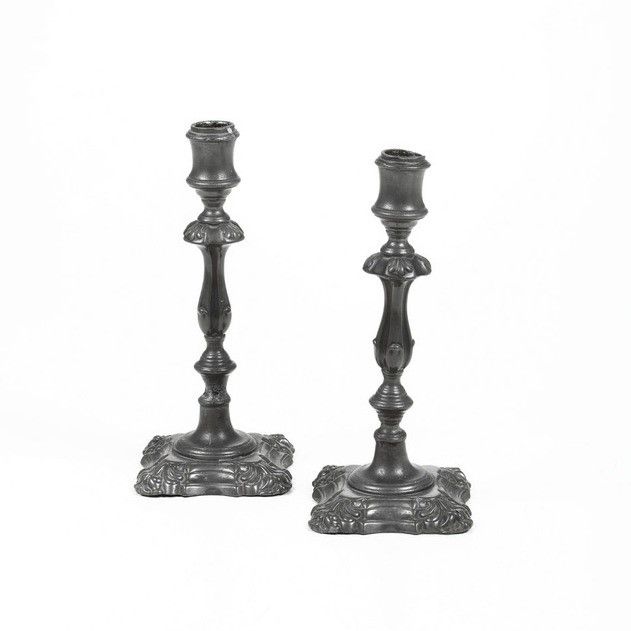 Coppia di candelieri ad una luce in metallo argentato. XX secolo