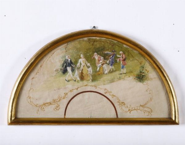 Pagina di ventaglio decorata in policromia a scena galante, in cornice