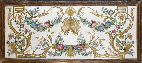 Pannello dipinto a motivi floreali con decori dorati a rilievo. Fine XIX secolo