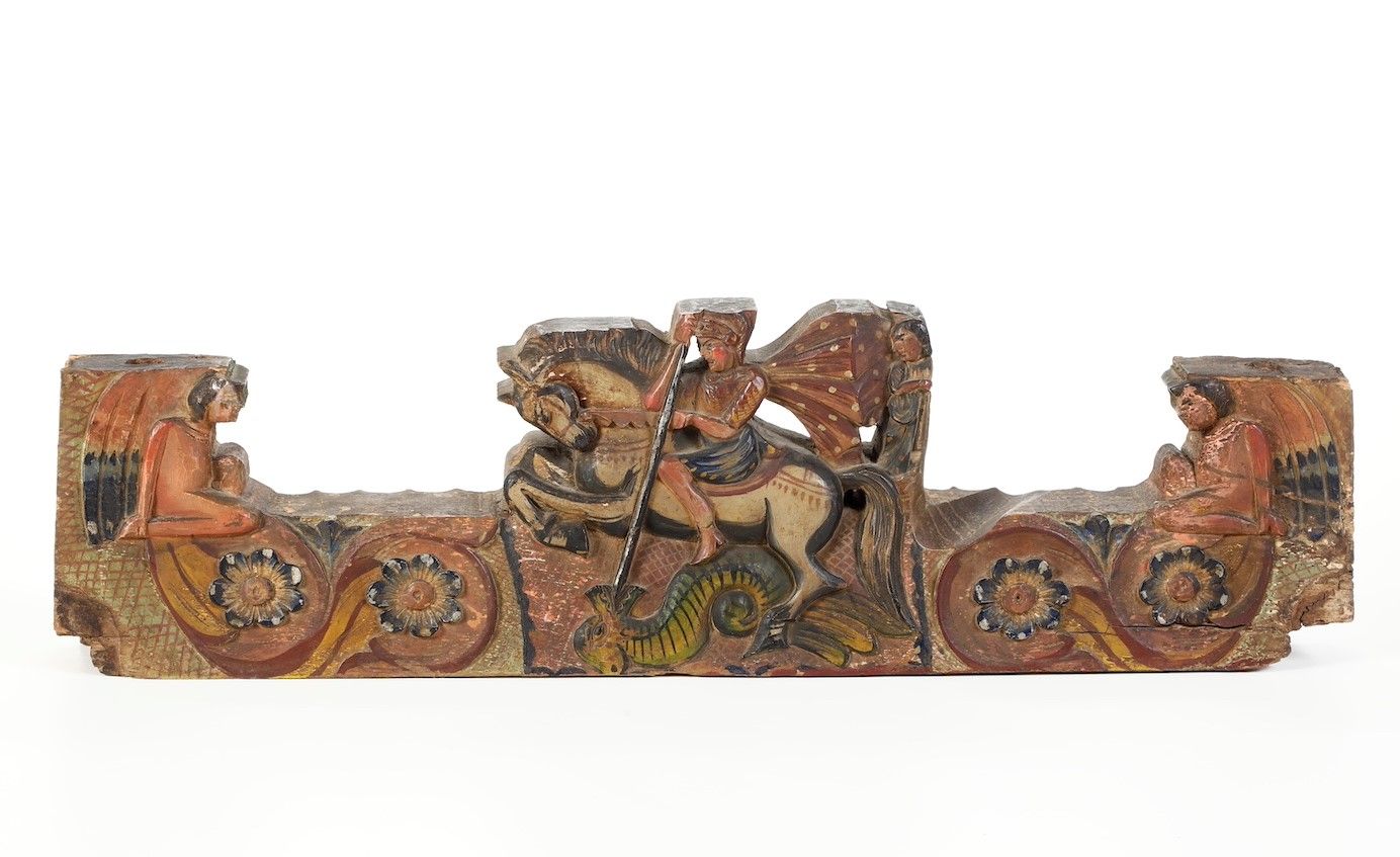 Porzione di carretto siciliano in legno intagliato e dipinto. XX secolo