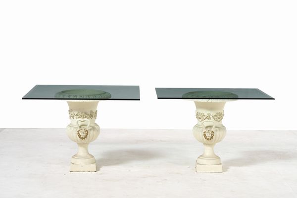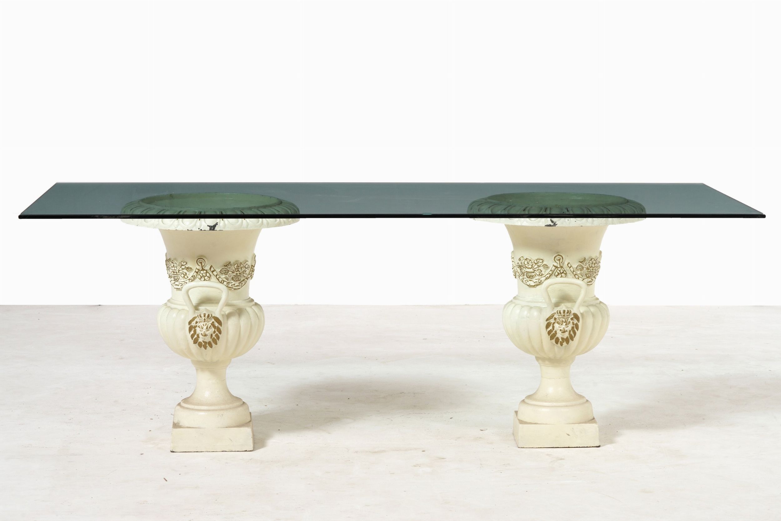 Tavolo con piano in vetro e sostegni a guisa di vasi medicei. XX secolo
