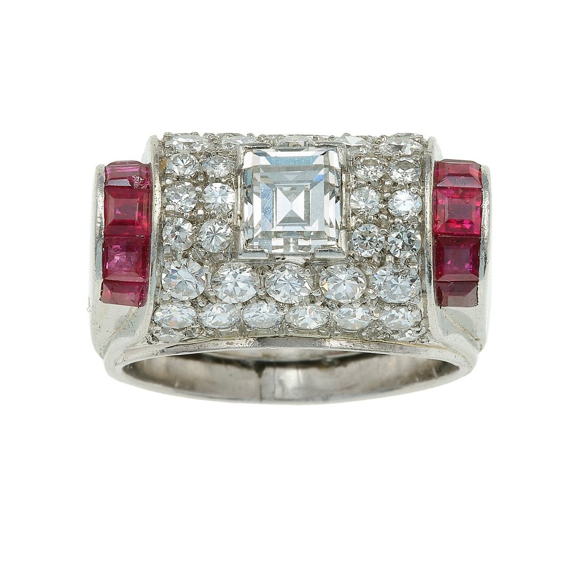 Anello con diamante centrale taglio baguette di ct 0.80 circa, diamanti a contorno [..]