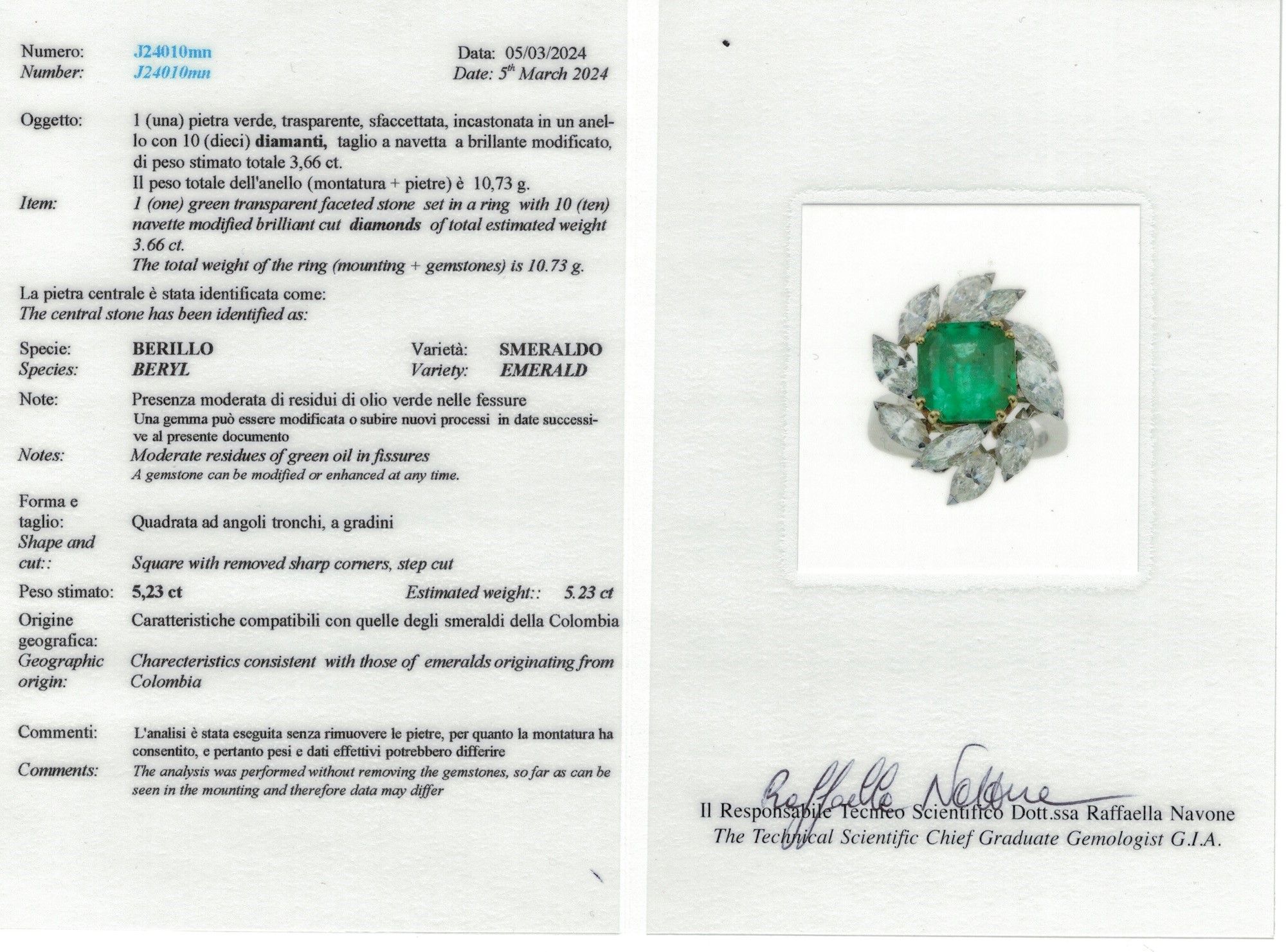 Anello con smeraldo Colombia di ct 4.98 circa e diamanti taglio navette