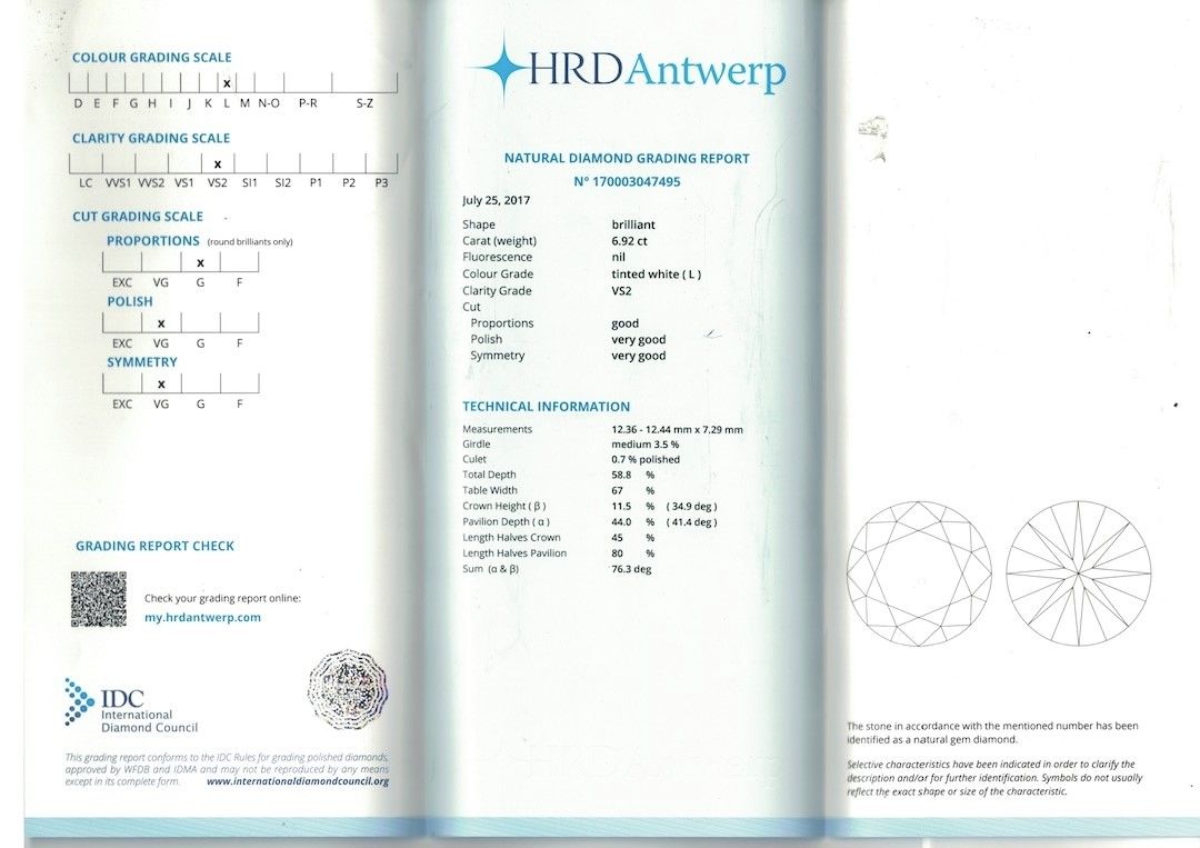 Diamante taglio rotondo a brillante di ct 6.92, colore L, caratteristiche interne [..]