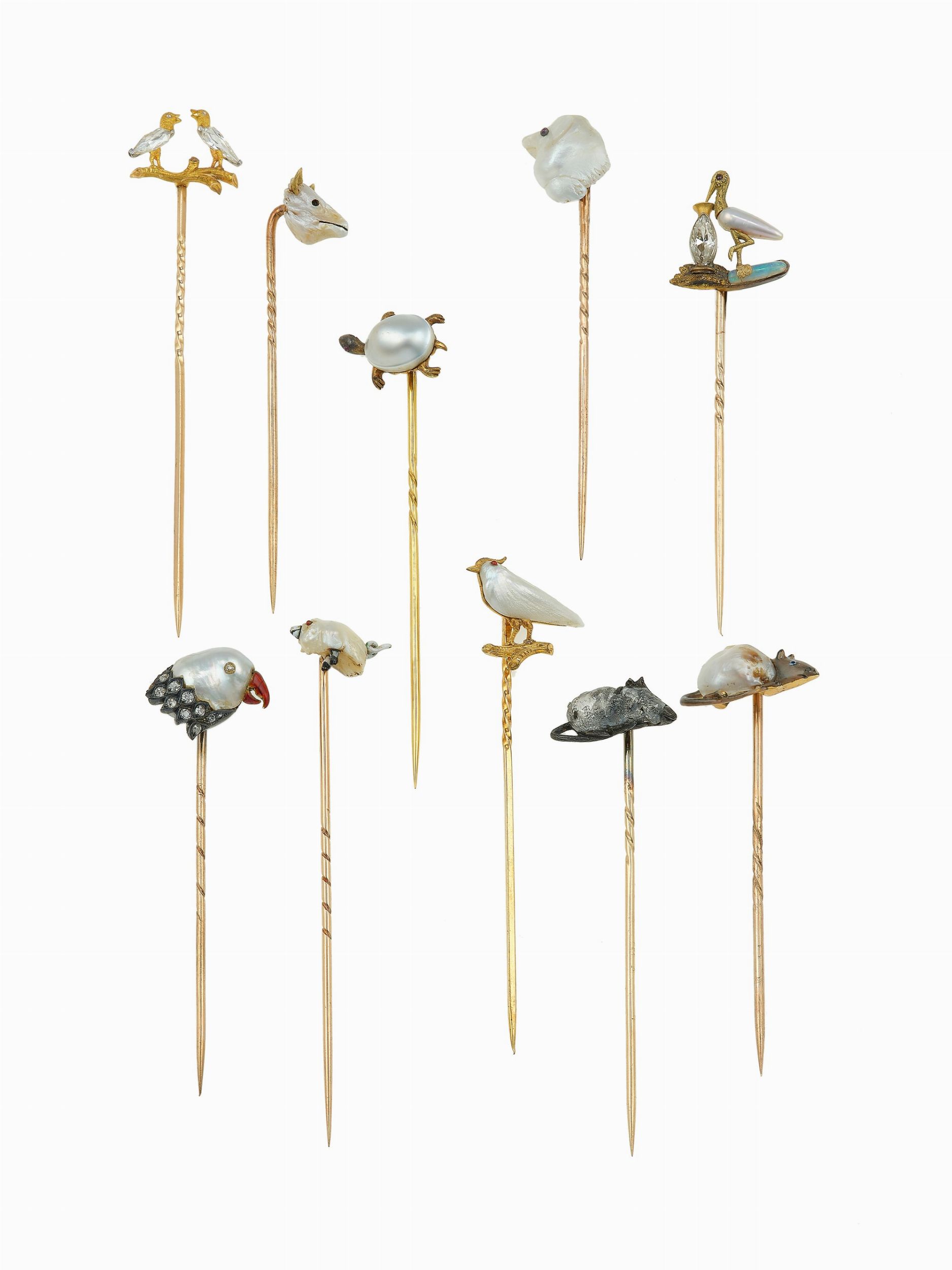 Lotto composto da 10 spilloni in oro, argento, perle, smalti, diamanti e cristallo [..]