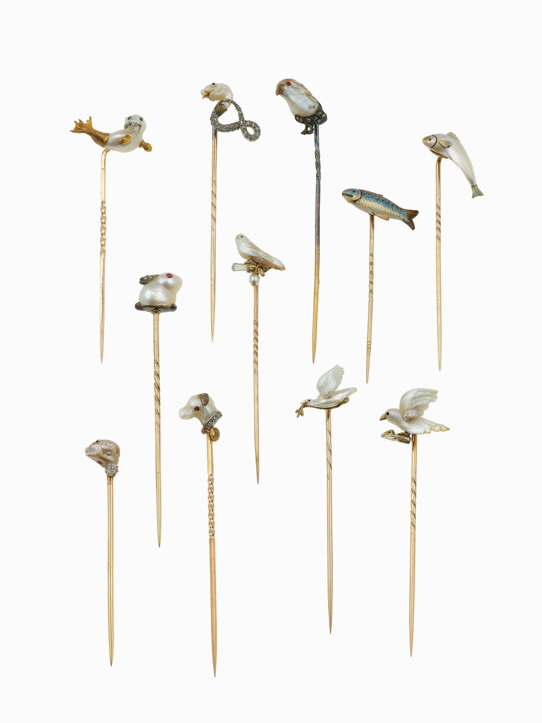 Lotto composto da 11 spilloni in oro, argento, perle, smalti e diamanti