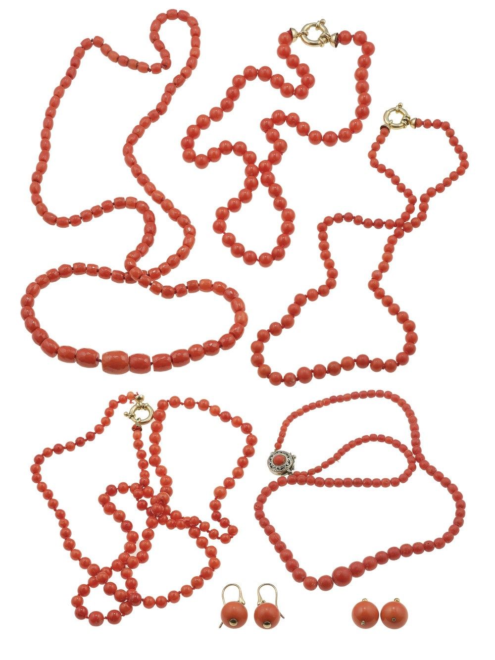 Lotto composto da cinque collane e due paia di orecchini con corallo
