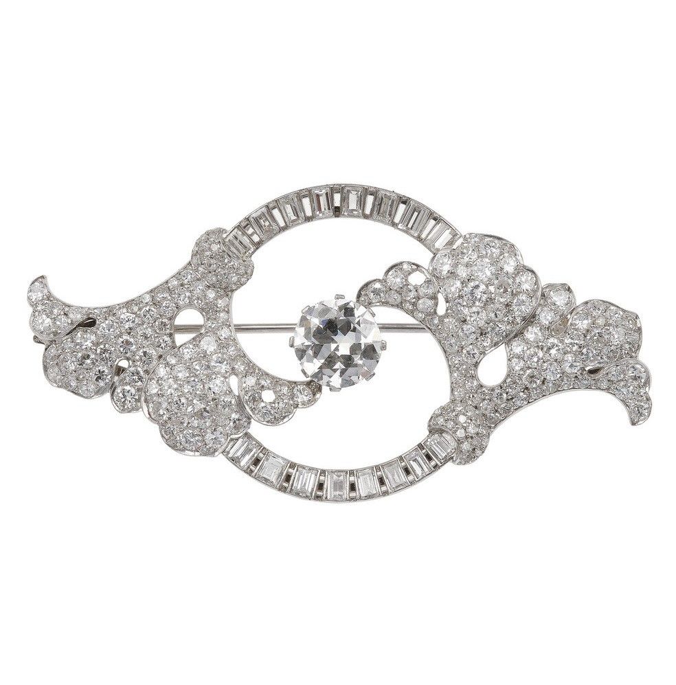 Ravasco. Spilla con diamanti taglio rotondo e baguette, diamante centrale, taglio [..]