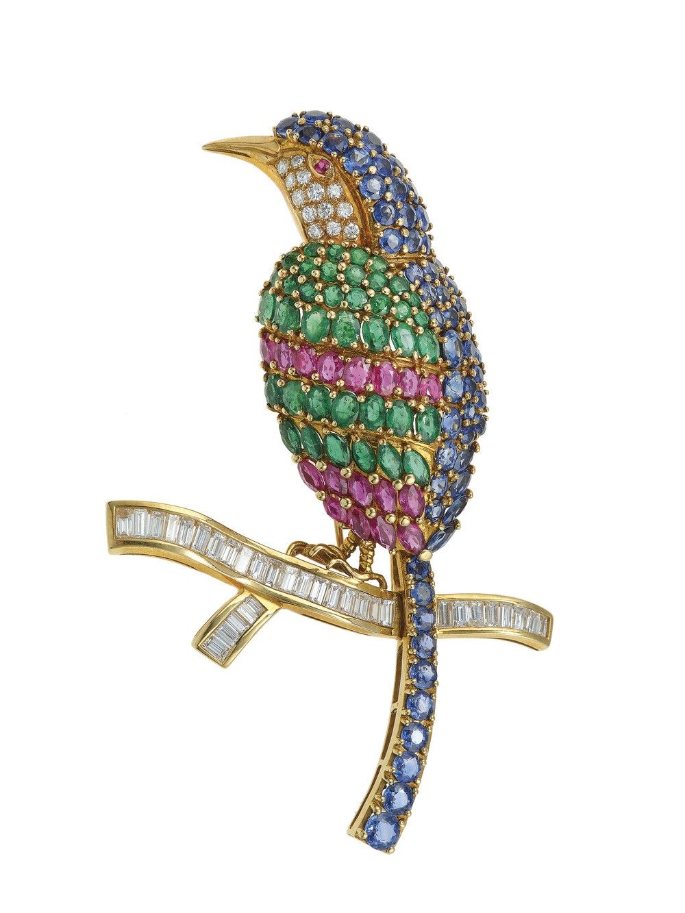 Spilla uccellino con diamanti, rubini, smeraldi e zaffiri