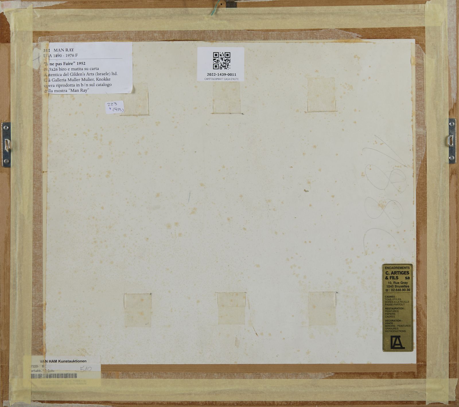titoloL'autenticità dell'opera è stata confermata dal Man Ray Expertise CommitteeL'opera sarà inclusa nel Catalogue of Works on Paper of Man Ray, di prossima pubblicazionePROVENIENZAJuliet Man Ray Sotheby's, Londra 1995, lot 370 (il presente lotto è uno dei 12 disegni)Eric Mulier Gallery, Knokke-le-ZouteGilden's Arts, London and Israel Collezione privata, TorinoESPOSIZIONIMan Ray, Mulier Mulier Gallery, Knokke-Heist 30 marzo-15 maggio 1996BIBLIOGRAFIA?Man Ray, Bruxelles 1996, ripr. s.i.p.?M. Franciolli, G. Comis, Janus, Man Ray, Milano 2001, p. 285, n. 284