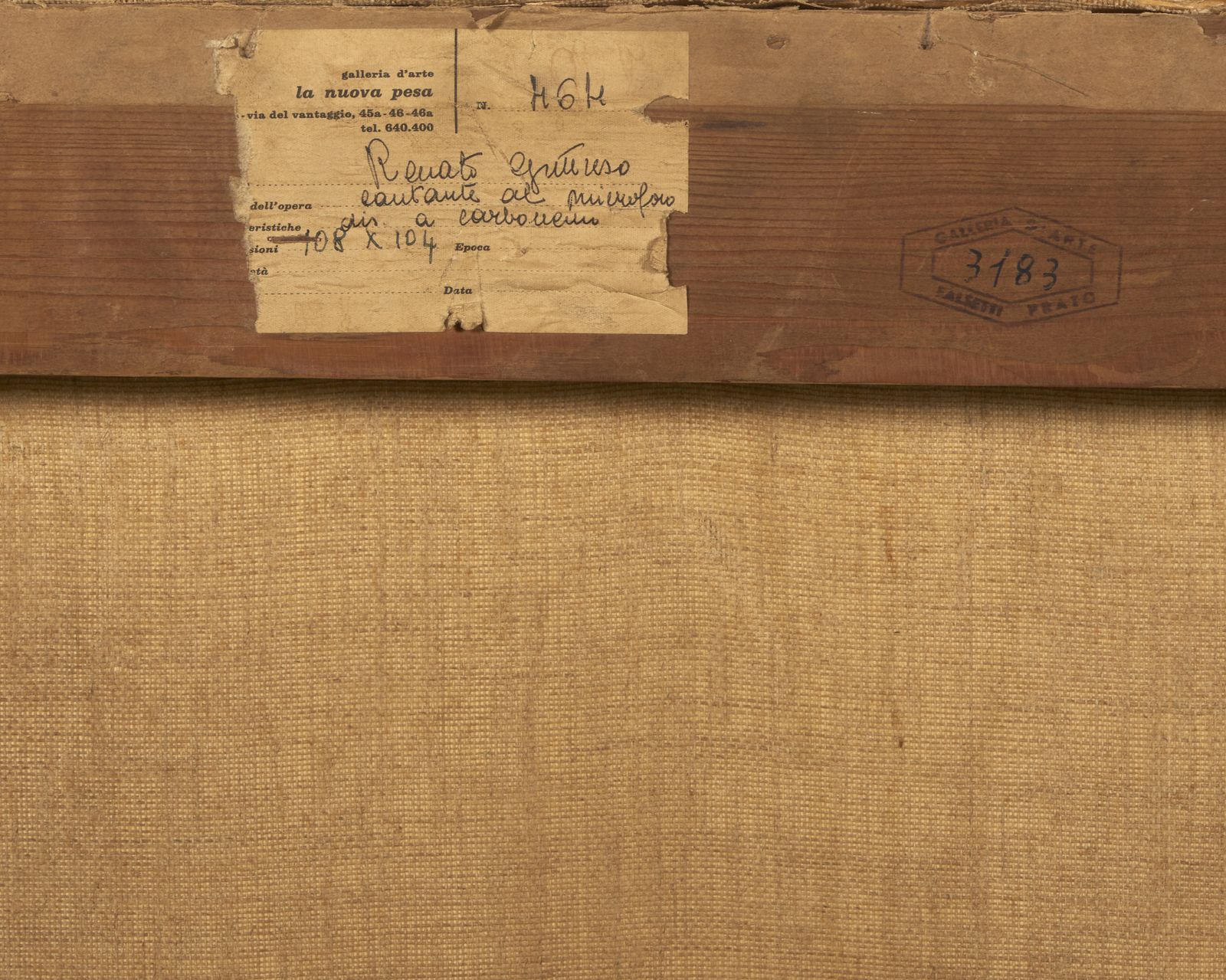 firmasul retro: etichetta Galleria d'arte La nuova Pesa, Roma e timbro Galleria d'arte Falsetti, PratoL'opera è accompagnata dal certificato degli Archivi Renato Guttuso, RomaPROVENIENZAGalleria La Nuova Pesa, RomaGalleria d'arte Falsetti, PratoCollezione privata, Brescia