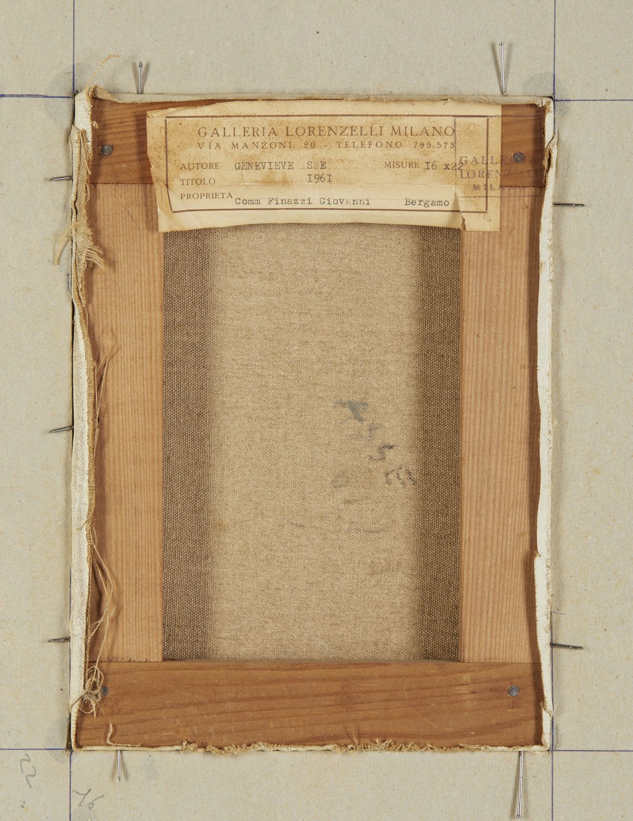 sul retro: firma e data. etichetta e timbro Galleria Lorenzelli, MilanoPROVENIENZACollezione privata, BergamoGalleria Lorenzelli, MilanoCollezione privata, BresciaESPOSIZIONIAsse, Galleria Lorenzelli, Milano aprile 1961BIBLIOGRAFIAAsse, Bergamo 1961, s.i.p., n. 9