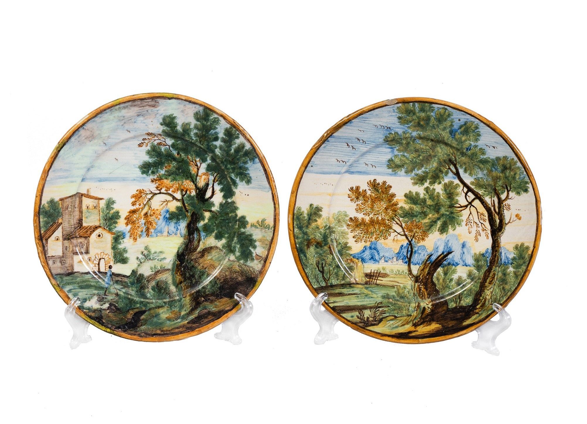 in maiolica dipinta in policromia con paesaggi alberati, cm 18,5 cad.