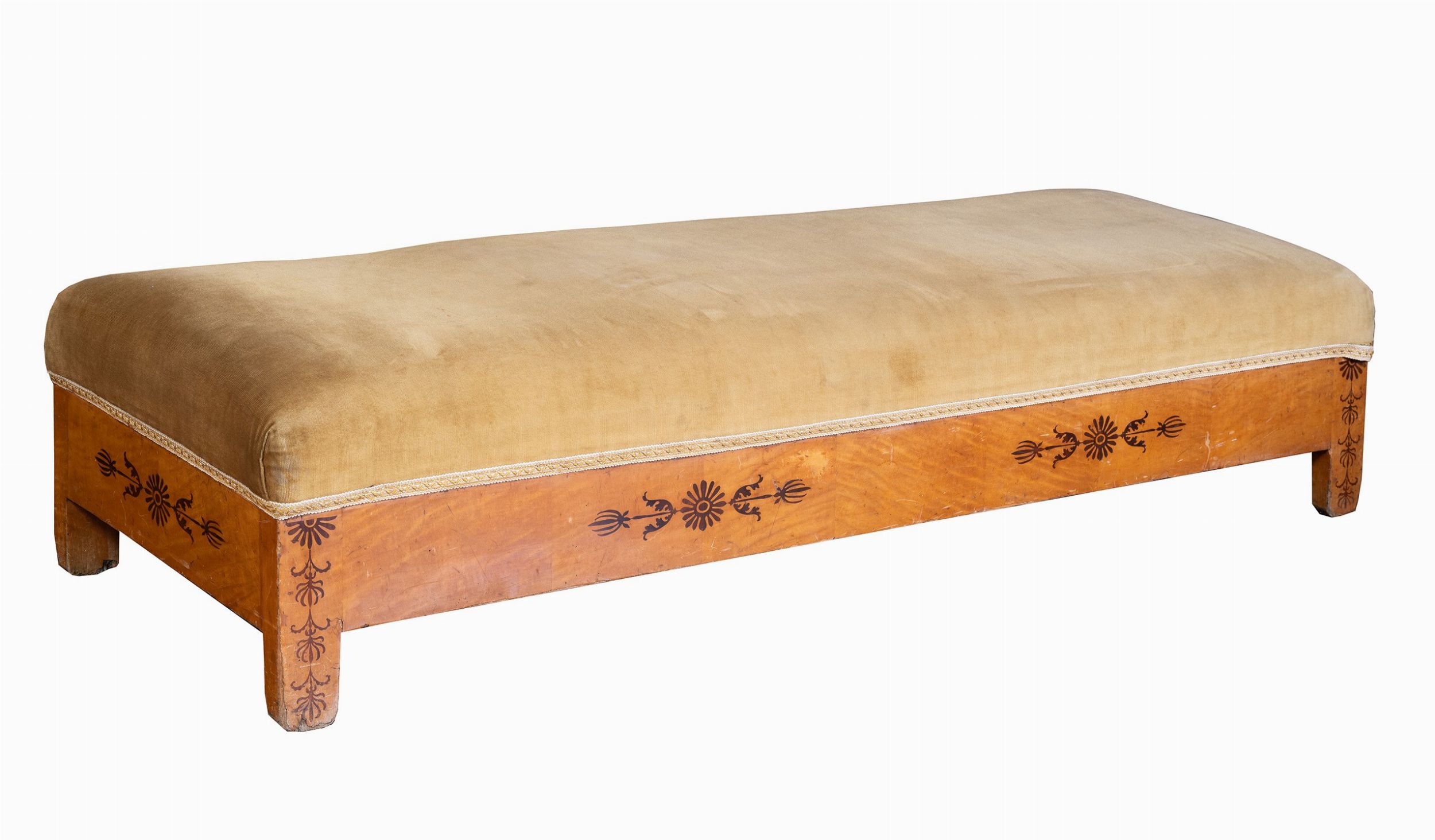 con intarsi floreali in legno di frutto, seduta con imbottitura in velluto ocra