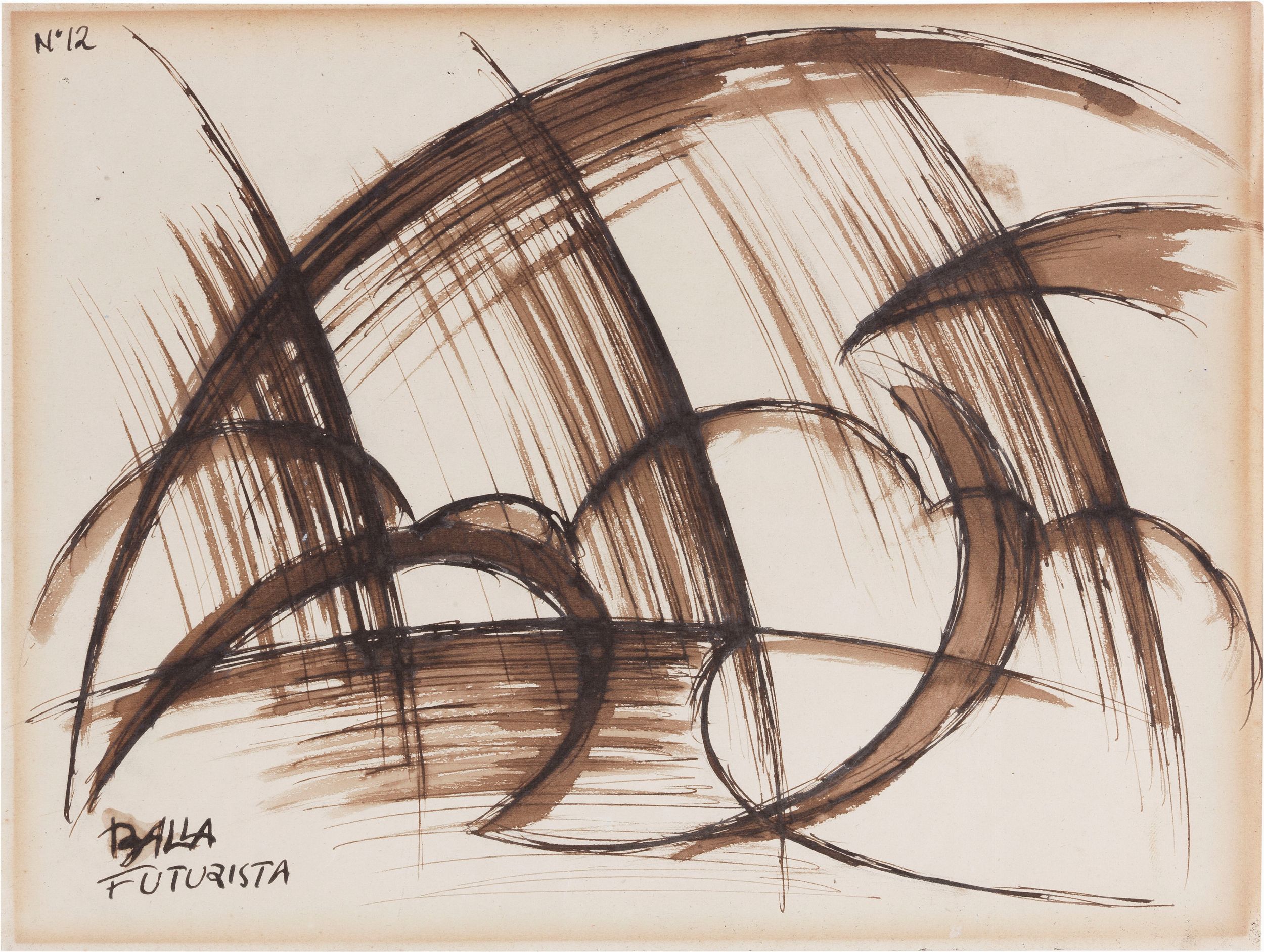China su carta, cm. 18,5x24,5 1913 Firma in basso a sinistra: Balla / Futurista, numero in alto a sinistra: N. 12. Al verso, su un cartone di supporto: etichetta Speed - A Arte da Velocidade, con n. 138: etichetta Arte Centro / 12 - 29 Futur Balla / a cura di Elena Gigli / 6 novembre - 20 dicembre 2008: timbro ed etichetta con n. 9176 Arte Centro, Milano: timbro Arte Centro, Milano.