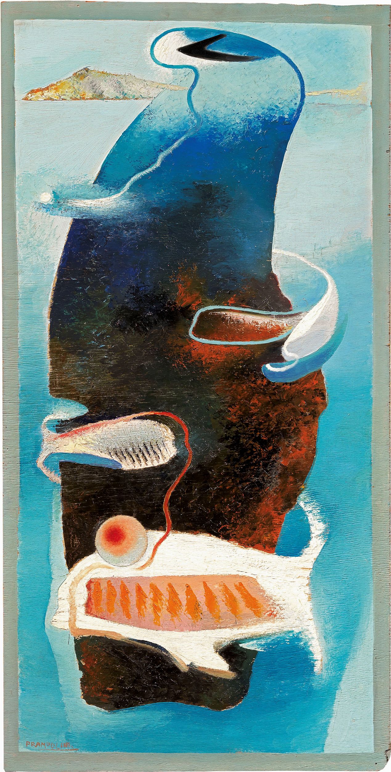 Olio su tavola, cm. 100x50 1932 ca. Firma in basso a sinistra: Prampolini; dedica e firma al verso: All'amico Angelo Celesia / in segno d'amicizia / Enrico Prampolini / [Roma] 1942: etichetta II Quadriennale d'Arte Nazionale / Roma / MCMXXXV (opera datata 1925): etichetta e due timbri Arte Centro, Milano, arch. A.C. 8571; su un pannello di supporto: etichetta Enrico Prampolini / Natura aerodinamica, 1932 ca. / Futur-ism 514 / Massimo Carpi / 3B Anni Trenta Quaranta.
