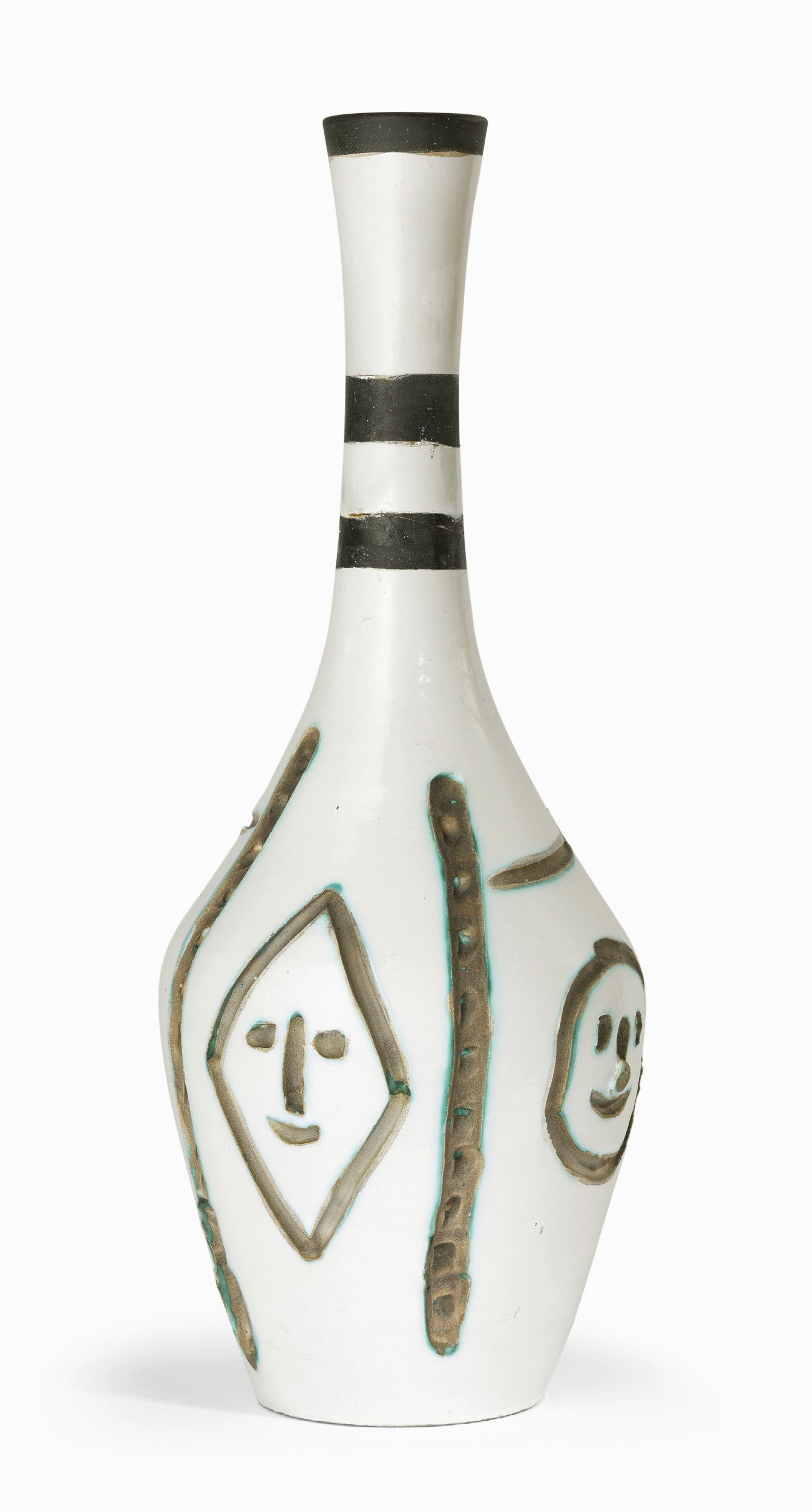 Terracotta bianca, decoro con ingobbi e paraffina, incisa a smalto bianco, nero e beige, es. 47/100, cm. 43 h.