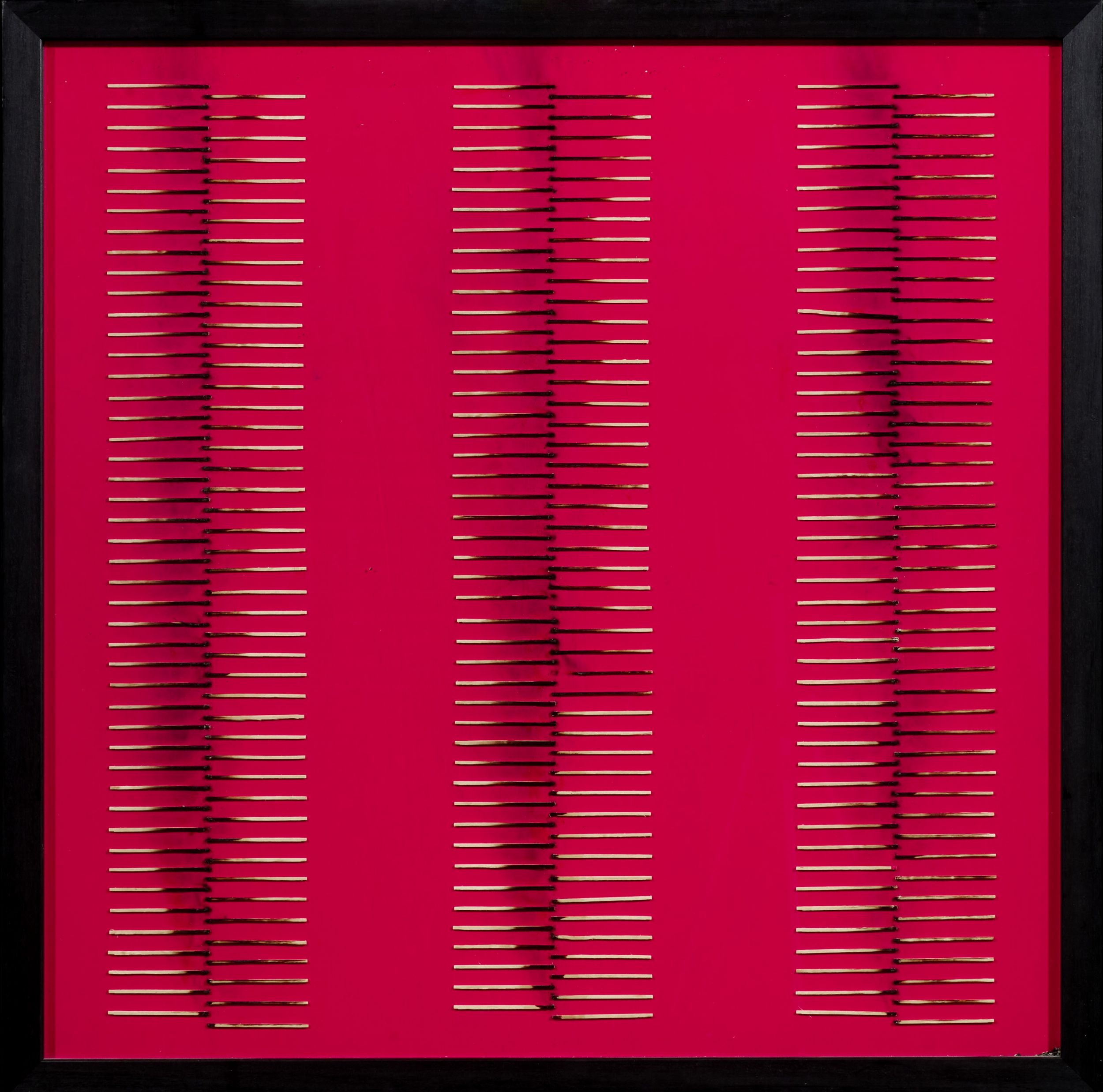 Fiammiferi bruciati su tavola rossa, cm. 100x100