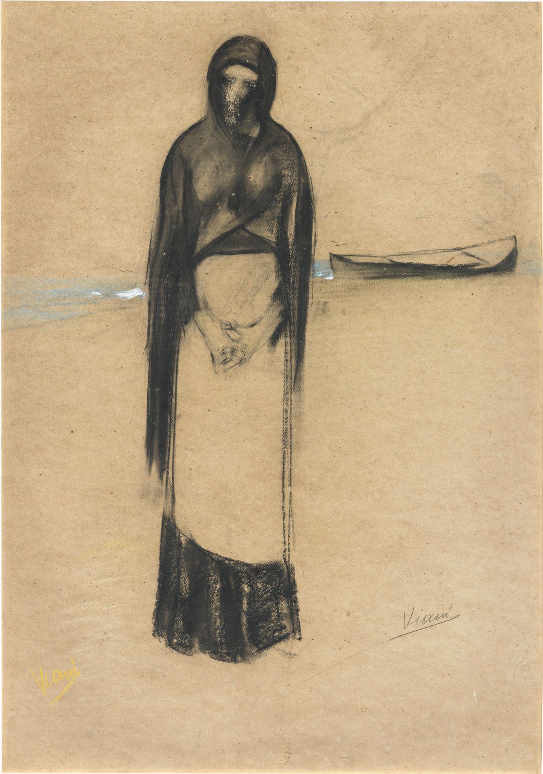 Titolo al verso: Aspettando il marito: scritta 90 Aspettando il marito; su un pannello di supporto: scritta 367 / aspettando il marito: etichetta Regione Piemonte / Città di Arona / Femme fatale / Il Mito universale della donna nell'arte / Lorenzo Viani (con titolo Donna del pescatore): invito Stagione artistica 1975-1976 / Mostra Lorenzo Viani 1882-1936, Galleria Pagani, Milano.