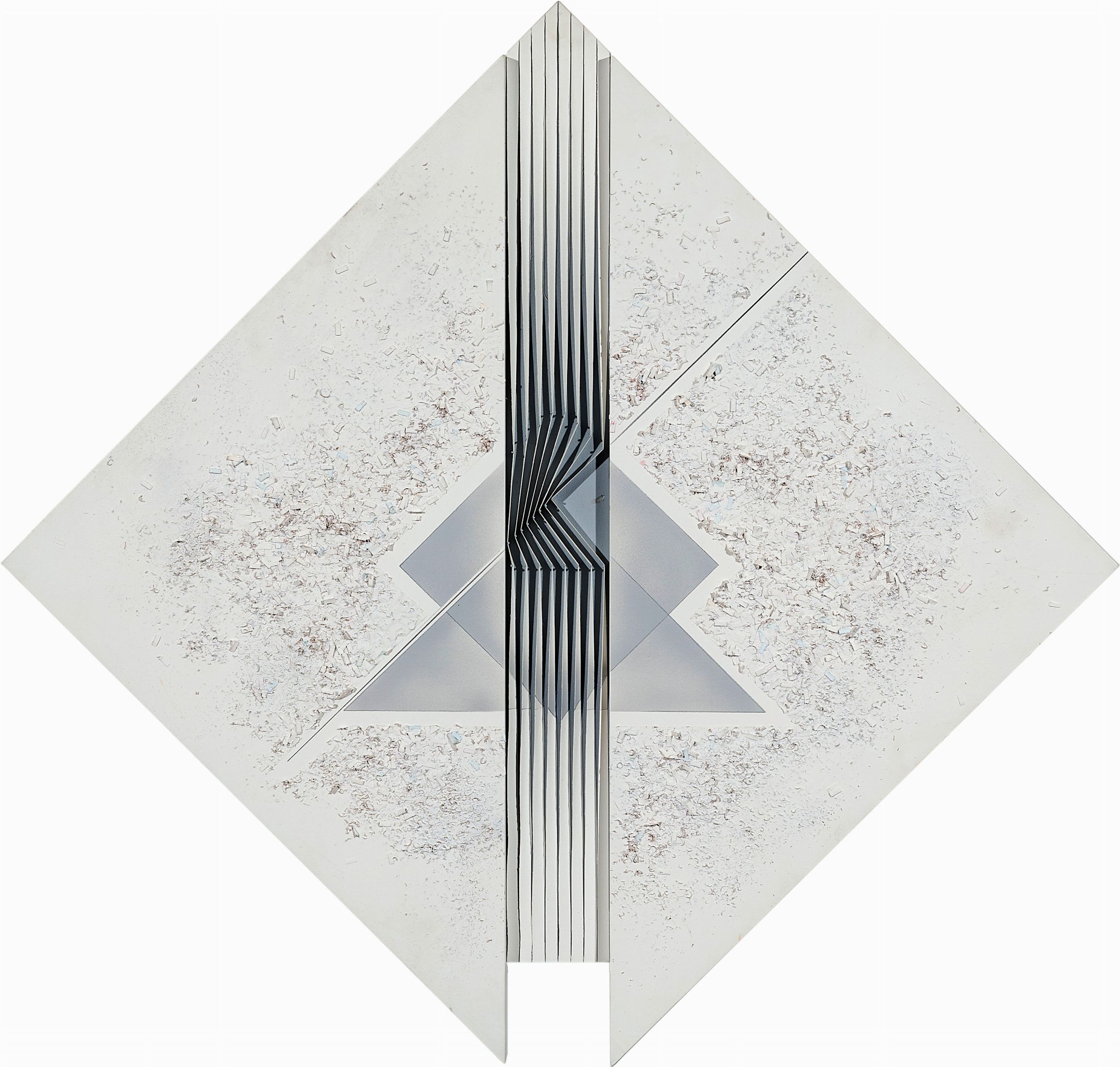 Tecnica mista e assemblaggio su tela tesa su tavola, cm. 75x75 (diagonali), cm. 55x55 (lato)